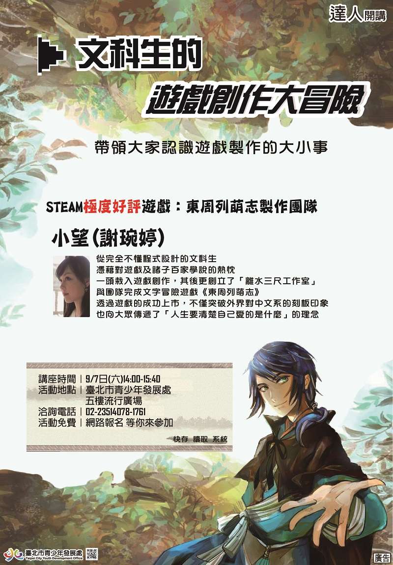 一、活動特邀steam極度好評文字冒險遊戲「東周列萌志」製作人謝琬婷小姐,帶領大家認識遊戲製作的大小事,分享如何從完全不懂程式的文科生,到完成獨立遊戲的經過。