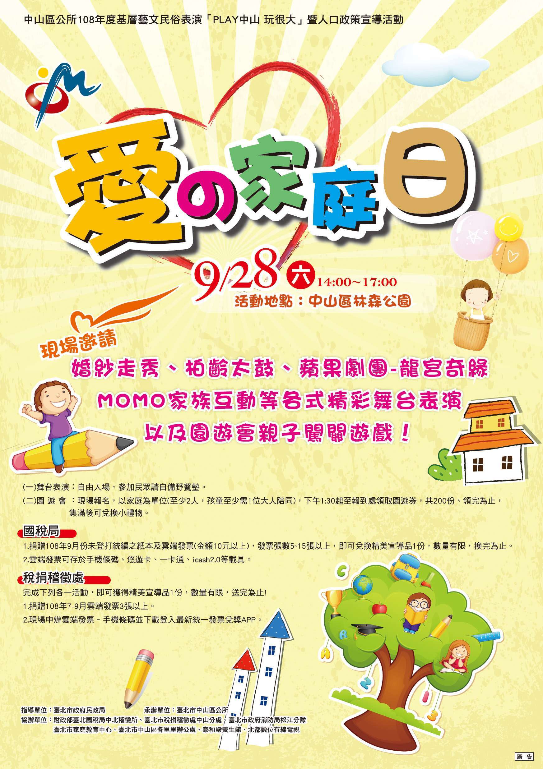 一、臺北市中山區公所於108年9月 28日(六)下午2時~5時假林森公園辦理108年度基層藝文民俗表演『PLAY中山 玩很大』暨人口政策宣導活動-『愛の家庭日』活動,包含創意婚紗秀、柏齡太鼓、蘋果劇團-龍宮奇緣、MOMO家族互動及親子園遊會。