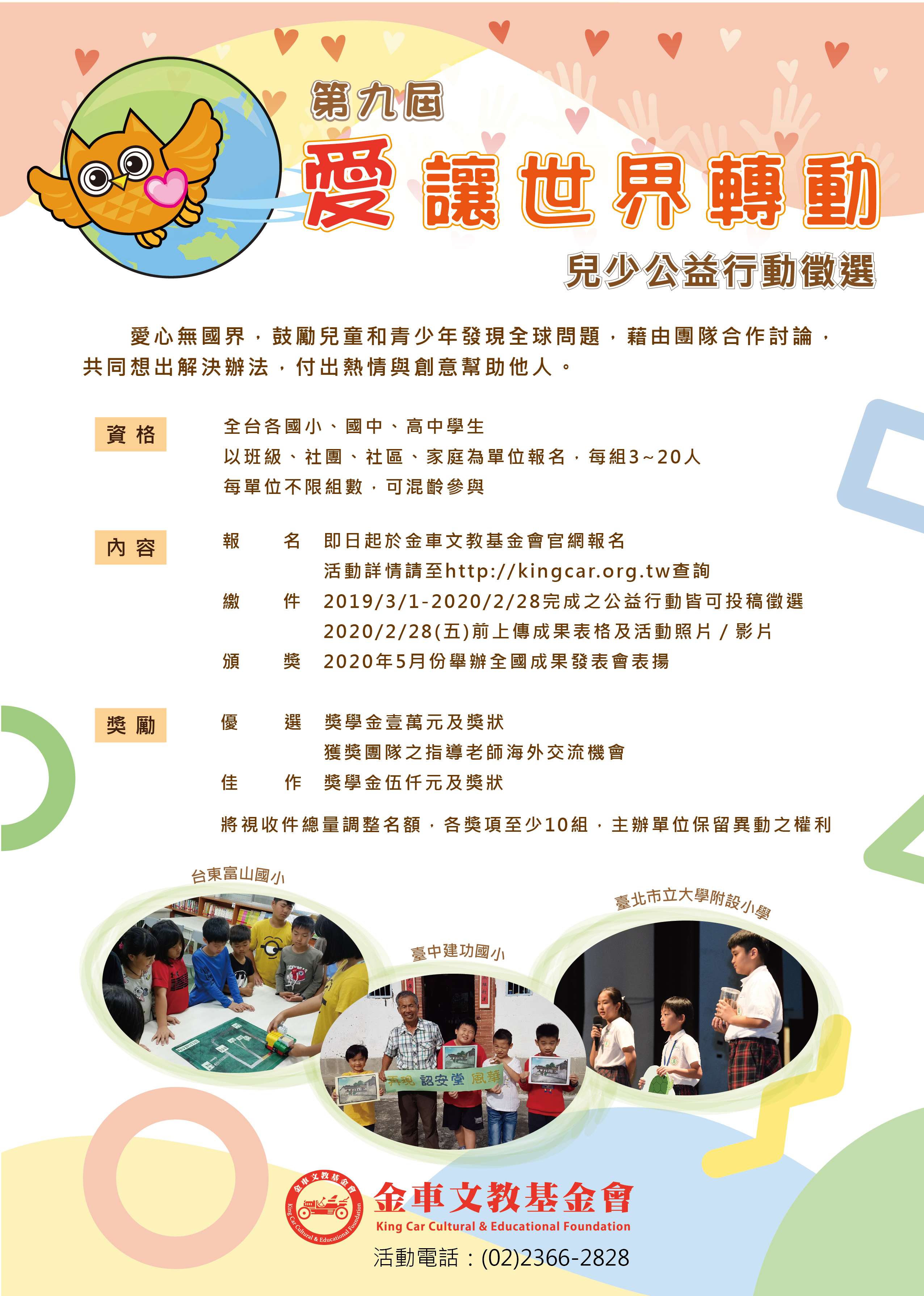 一、金車文教基金會自2011年開始舉辦「愛讓世界轉動 兒少公益行動」徵 選,8年時間累積超過7,000位來自全台各地同學踴躍參與,以STAGE行動步驟讓孩子走進世界舞台,學習發現問題、付諸行動、發揮愛心並能收穫成長。 二、「愛讓世界轉動 兒少公益行動」徵選資訊