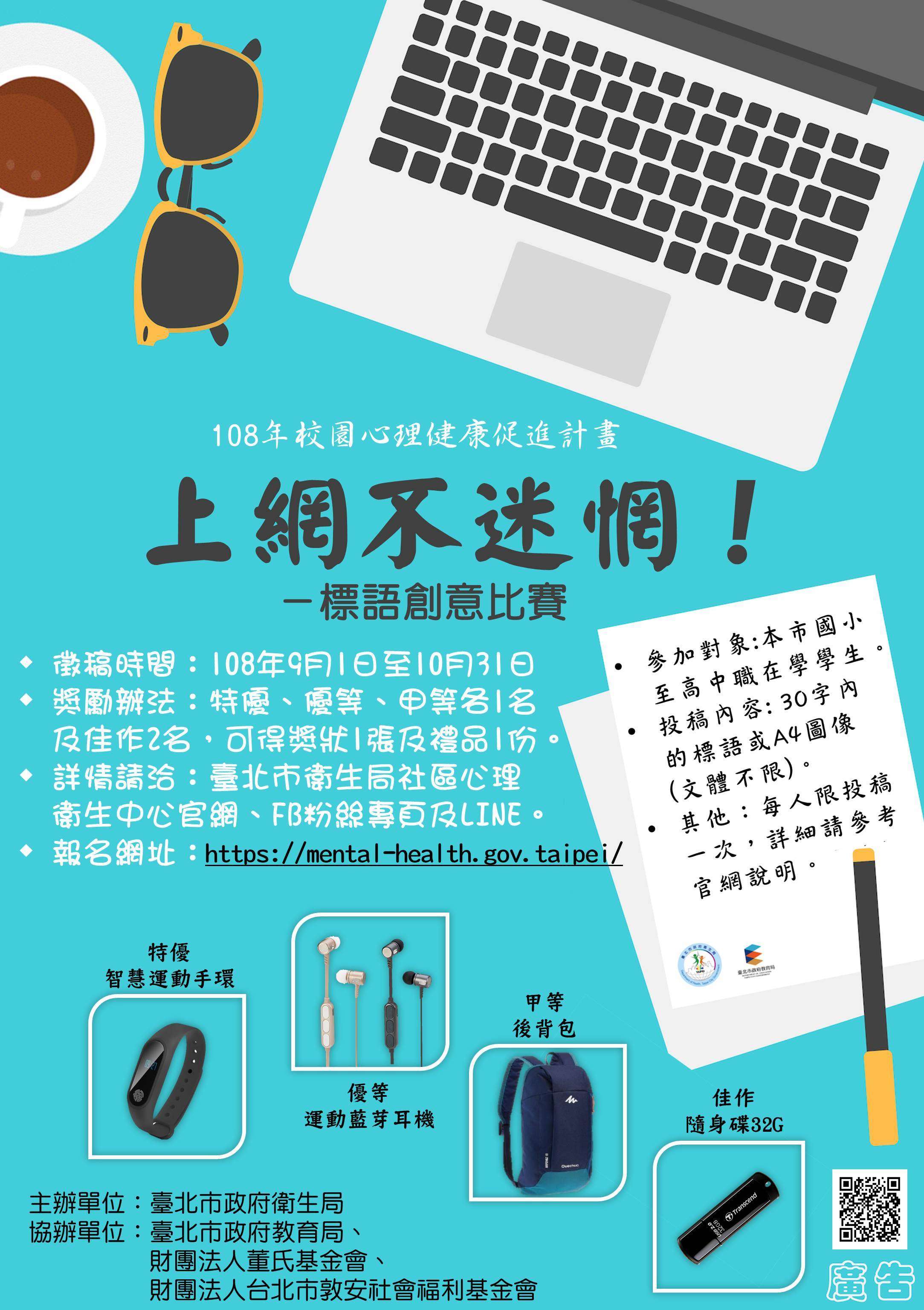 一、臺北市政府衛生局為為宣導正確使用網路健康觀念,鼓勵學生正向思考並發揮創意,宣導網路成癮防治健康促進議題,提倡適度使用網路,邁向戶外大自然,避免網路沉迷。特辦理本次活動。