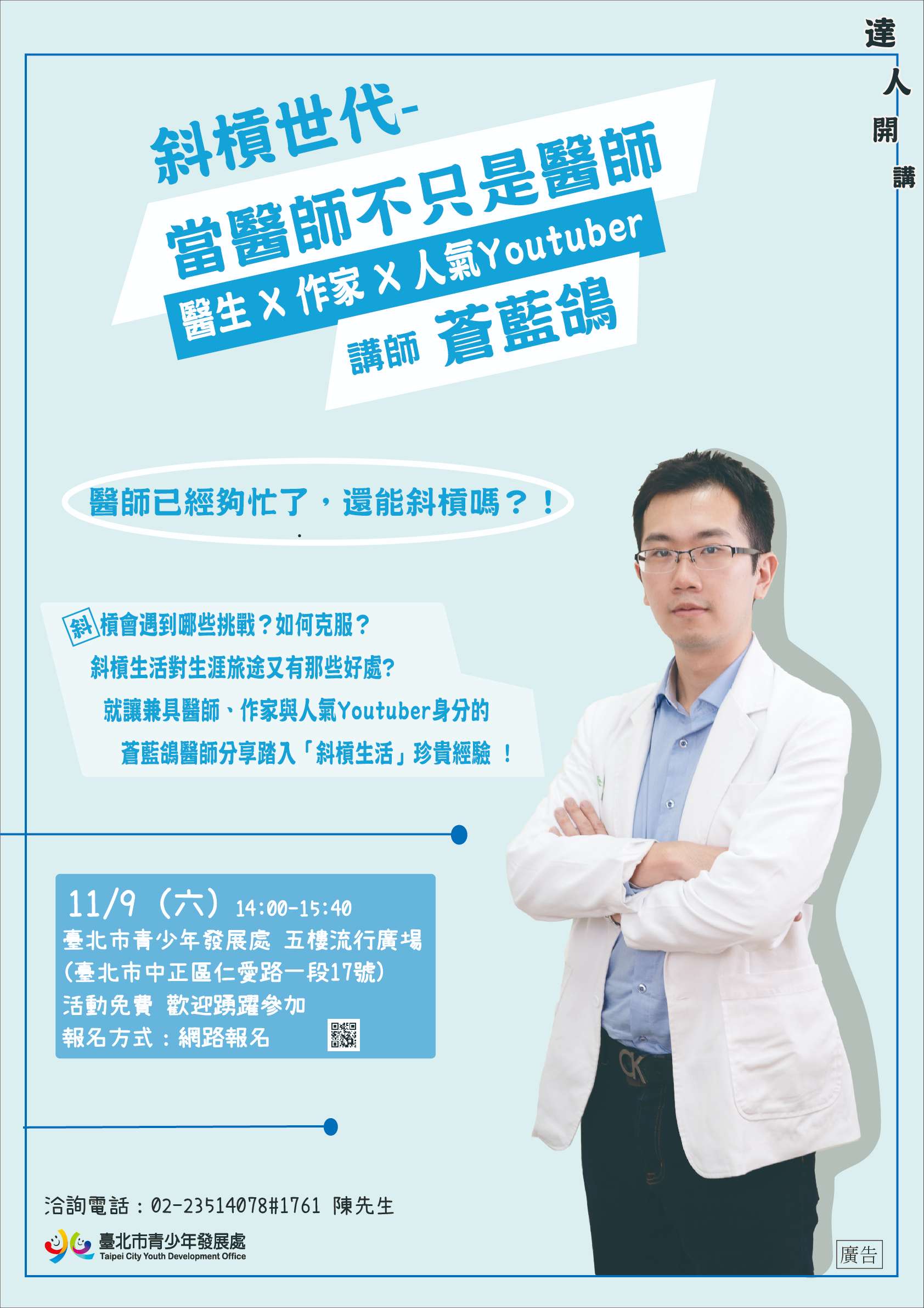一、青發處於11/9(六)14:00-1540舉辦達人開講「斜槓世代-當醫師不只是醫師」,活動特邀兼具醫師、暢銷書作家與人氣Youtuber身分的蒼藍鴿醫師,分享踏入「斜槓生活」的好處及在斜槓過程中遭遇的挑戰,活動報名網址:https://reurl.cc/72p0G9