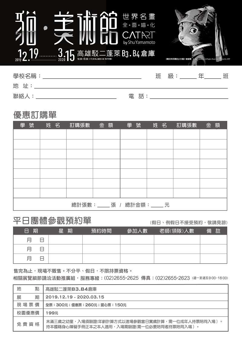 四、敬請惠予公告本展覽相關訊息於貴單位。 五、檢送本活動海報、優惠訂購單,呈請貴校員工、師生及家長踴躍參加。相關優惠預購詳情,請洽服務專線:(02) 2655-2625傳真:(02)2655-2623。