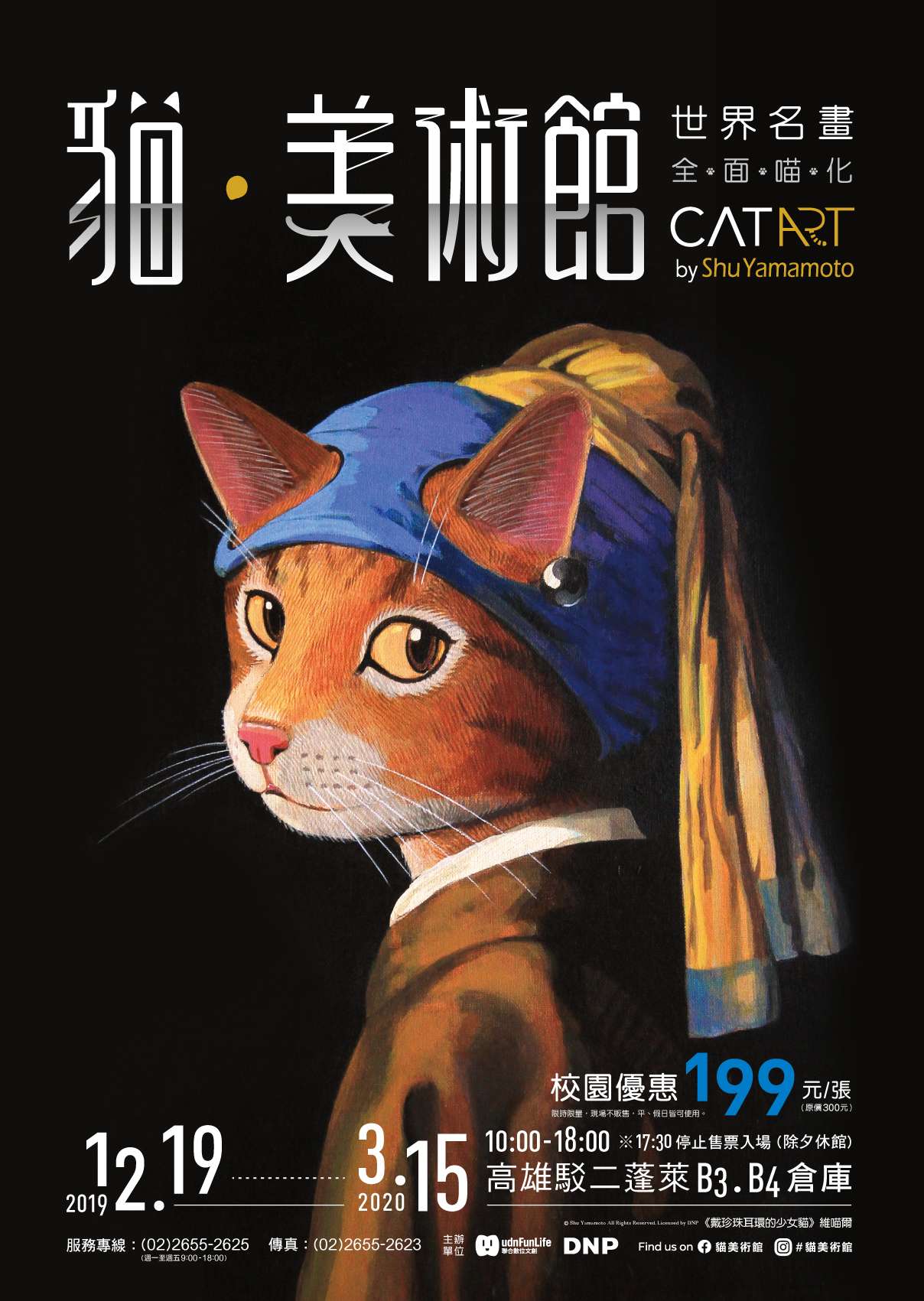 (三)展覽介紹:「貓•美術館」致力於提供一個全新的世界 觀,我們將以趣味的手法帶領大家認識「貓界」,透過 橫跨東西洋藝術史的藝術瑰寶,全面「喵化你的視界」!「貓•美術館」首次展出60件『CATART by Shu Yamamoto 世界名畫•全面喵化』的藝術創作,其中包含 維喵爾《戴珍珠耳環的少女貓》、喵文西《貓那麗 莎》、喵勒《拾貓草》等原創真跡作品,從「古代貓文 明」經過「文藝喵復興」、「巴洛克」、「喵歐古典主 義・浪漫主義・寫實主義」、「印象派」到「20世紀美 術」、「日本及亞洲美術」等展區來呈現貓藝術。在山 本修ShuYamamoto先生藝術創作的帶領下,透過橫跨東西 藝術史的曠世巨作,正式進入「貓的文藝世界」,感受 深度、豐富且高尚的貓文化。這座「貓•美術館」除了 觀賞「貓畫」外,還會不知不覺地受到「喵化」魔法的 影響,變身成為「貓界」的一員!在這個精心打造、超 級療癒的「貓界」裡,可以走入名畫變成貓,還有巨型 玻璃花窗「光之喵」、專屬於貓咪的「貓浮宮」、毛線 打造的「貓樂園」、塗鴉玩樂的「貓創空間」等,讓你 從貓的視角重新去認識世界,展現出各式各樣的慵懶、 俏皮「貓態」,隨心所欲地以貓的身份,盡情地沈浸在 美學饗宴中!在「貓•美術館」裡,不用理解作品的技 巧,不用思考作品的背景,不用定義作品的價值;喜 歡,就一直盯著看,這就是「貓•美術館」的真理。