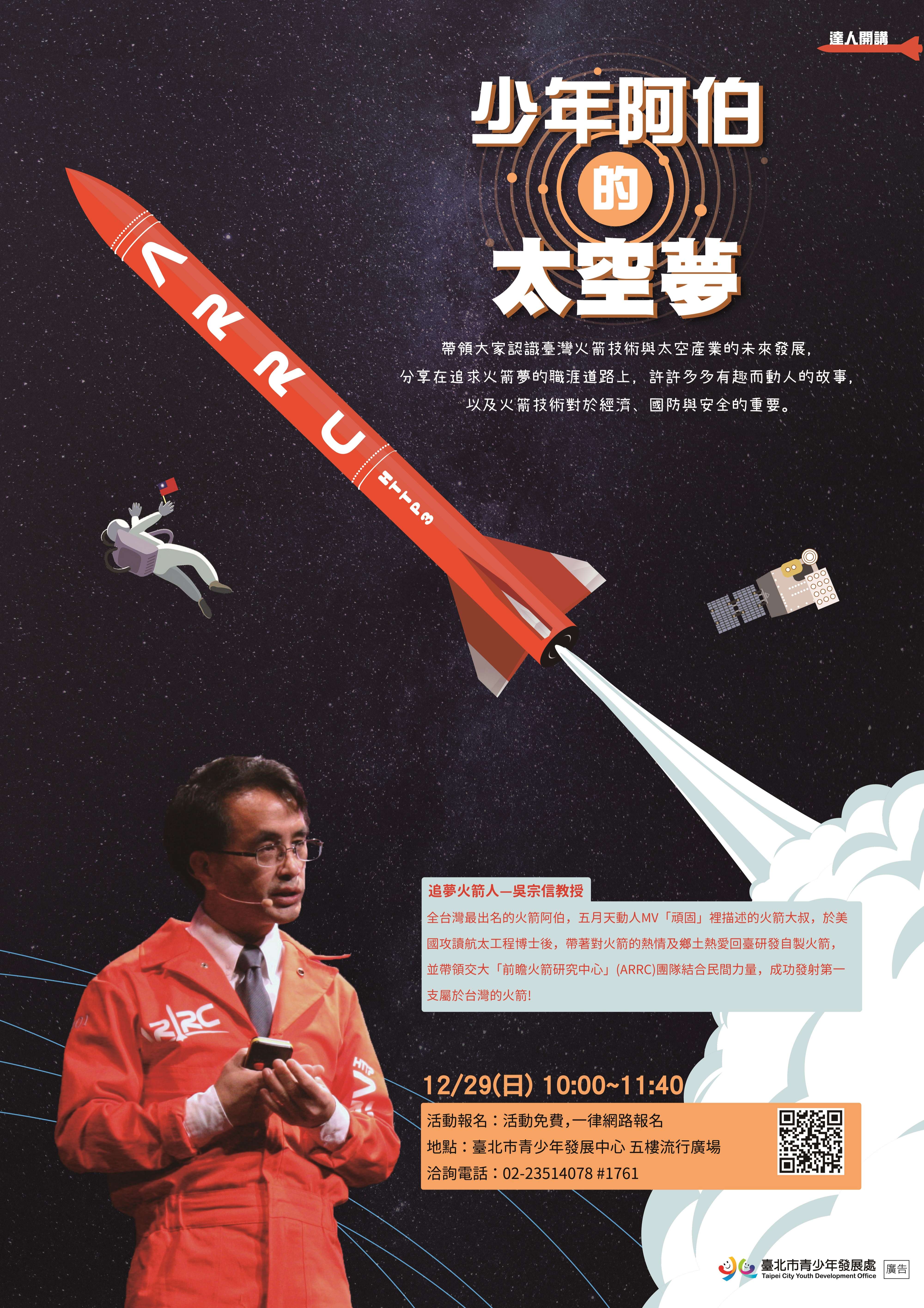 一、青發處於12/29(日)10:00-11:40舉辦達人開講「少年阿伯的太空夢」,活動特邀火箭阿伯-吳宗信教授帶領大家認識臺灣火箭技術與太空產業的未來發展,分享在追求火箭升空的職涯道路上,許許多多有趣而動人的故事,活動報名網址: https://reurl.cc/247MXv。
