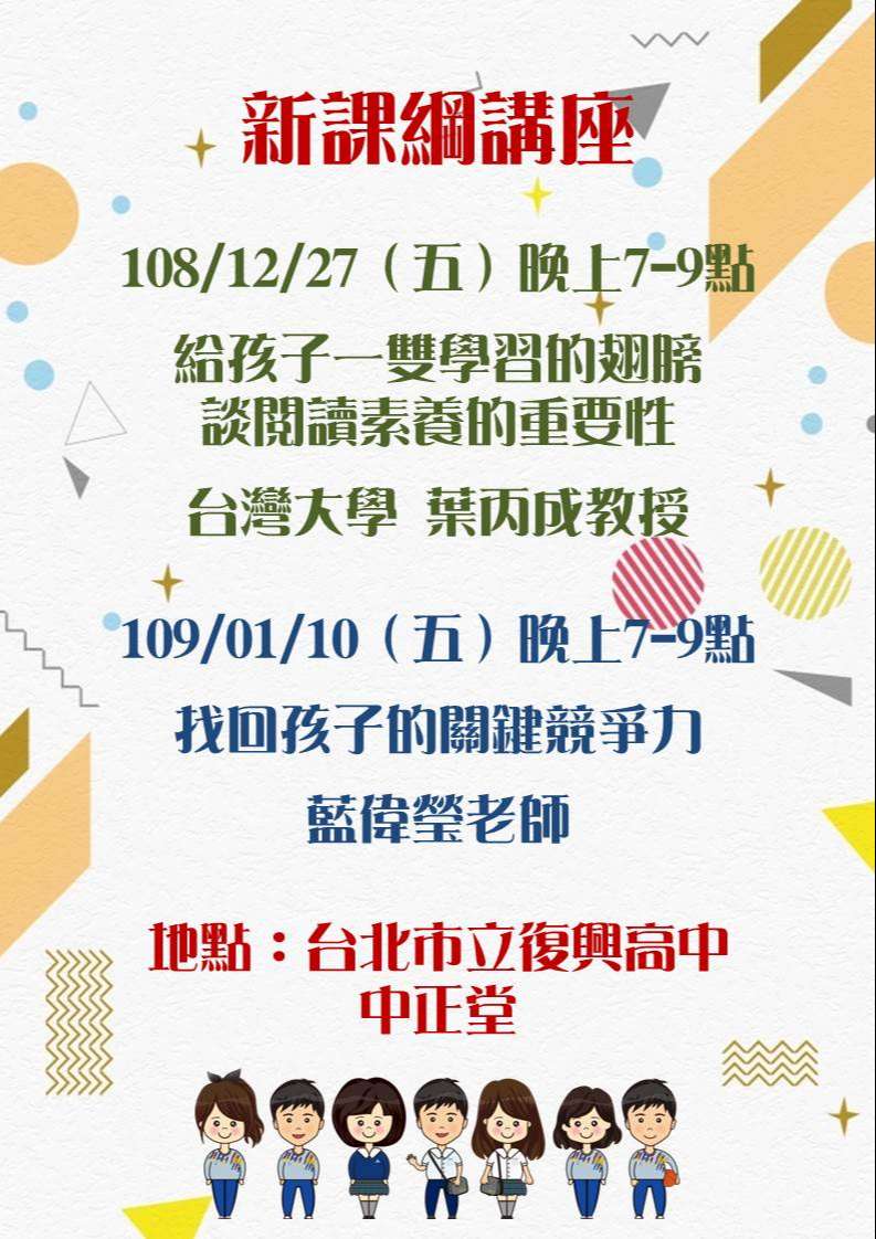 1.場次一:閱讀素養講座(黃國珍老師主講)108 /12/27(五)19:00-21:00。