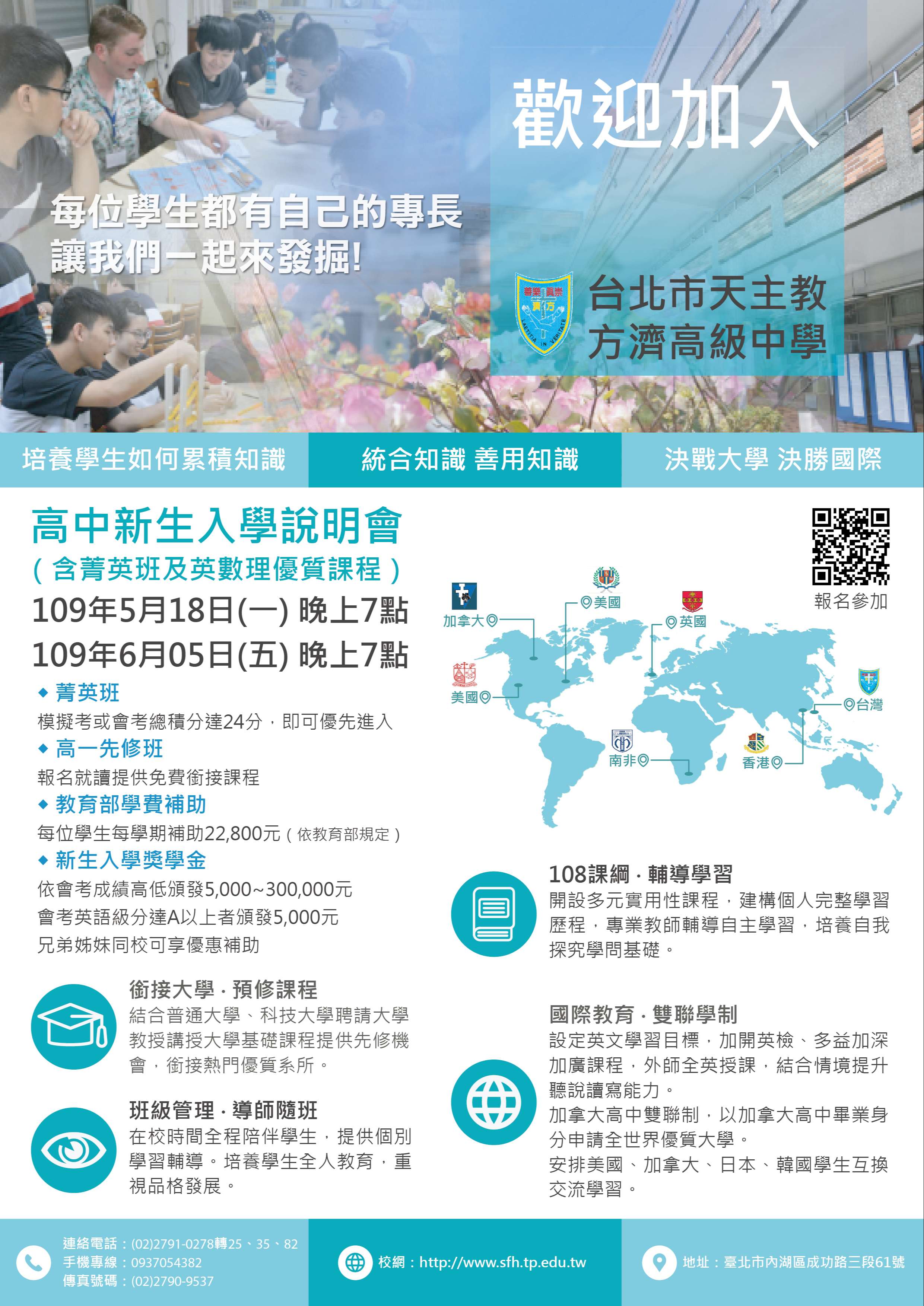 三、提供說明會及參訪 (一) 新生入學說明會第一梯次:109年5月18日(一)晚上7: 00,有意參加學生、家長請上方濟中學網站首頁點選 「參加報名系統」→「高中部~109高一新生入學~說明預約報名」進入。(二) 新生入學說明會第二梯次:109年6月5日(五)晚上7: 00,有意參加學生、家長請上方濟中學網站首頁點選 「參加報名系統」→「高中部~109高一新生入學~說明預約報名」進入。歡迎家長向教務處報名。聯絡人:教務處黃老師。電話:27910278轉35。