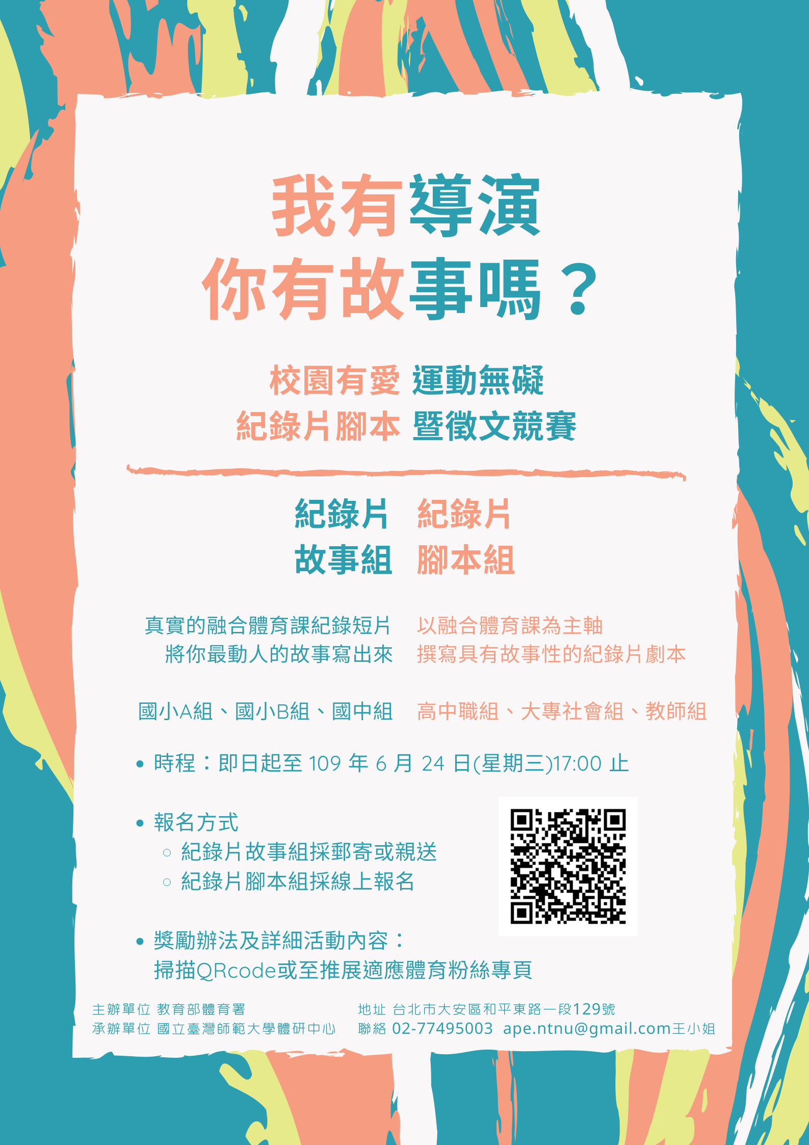 國立臺灣師範大學辦理「2020校園有愛運動無礙紀錄短片腳本暨徵文比賽」報名即日起至6/24日止!歡迎有興趣師生踴躍參加!