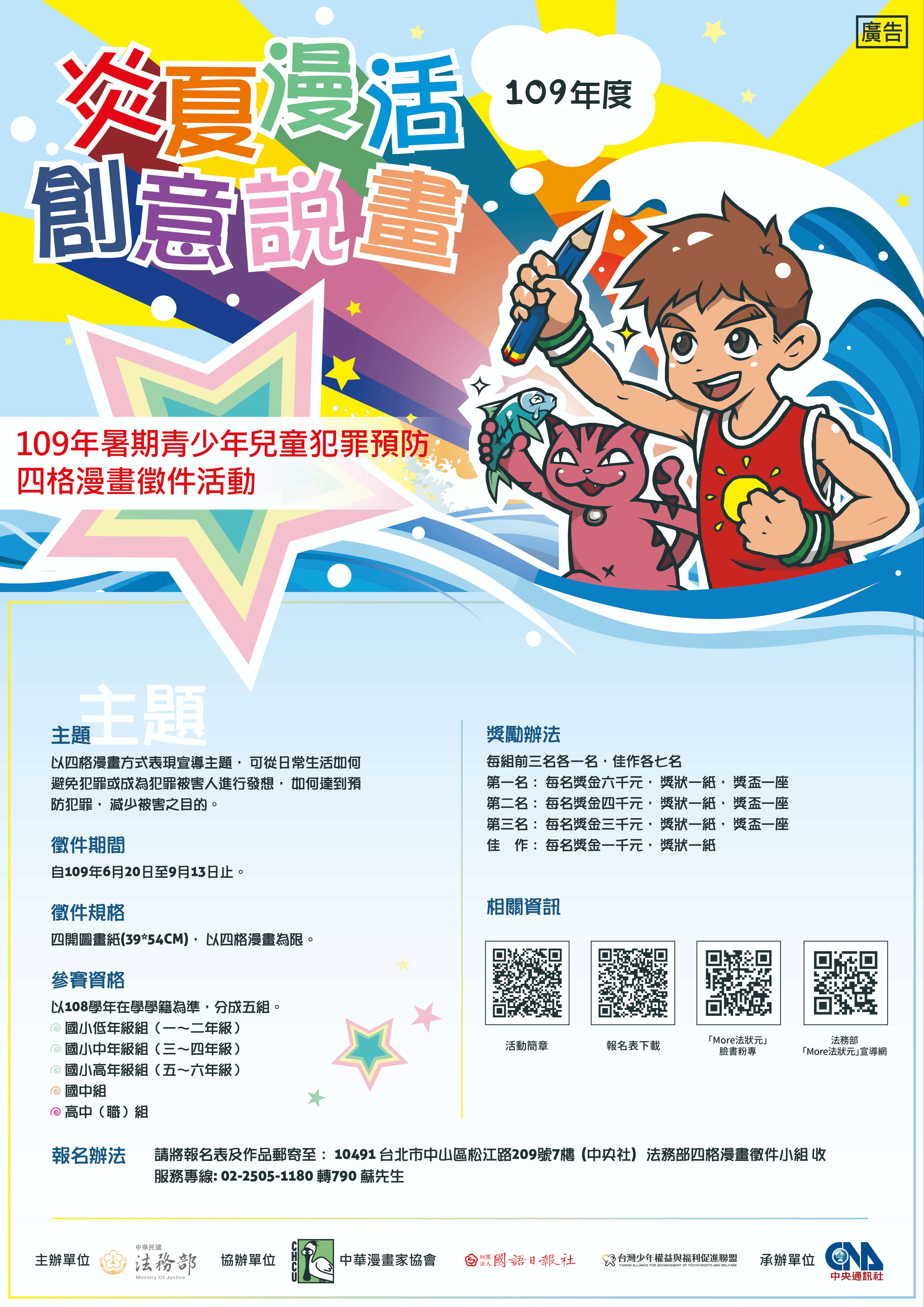 法務部「炎夏『漫』活,創意說『畫』」109年暑期 青少年兒童犯罪預防四格漫畫徵件活動