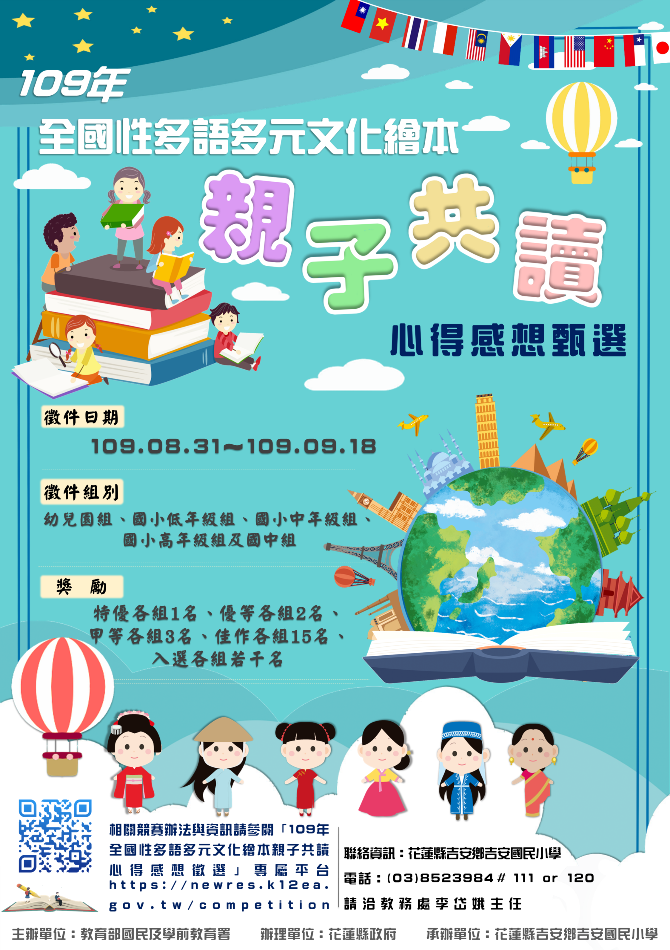 三、旨揭甄選活動相關資訊如下: (一)參加對象:全國公私立幼兒園、國小及國中學生。 (二)收件期間:自109年8月31日(星期一)起至109年9月18日 (星期五)止。 (三)參賽內容 1、徵件主題:多元文化繪本或相關書籍親子共讀心得感想。 2、心得內容:凡多元文化繪本或相關書籍,包含各國人 文、歷史、地理及風俗民情等內容皆可。 3、分組徵件:分為幼兒園組、國小低年級組、國小中年級組、國小高年級組及國中組,共計5組。 4、送件數量:每人限投稿1件,每件作品作者限為1人。 (四)徵件格式及報名方式請詳閱計畫書。 (五)報名網址:請至「109年全國性多語多元文化繪本親子共讀心得感想甄選」專屬平臺(https://newres.k12ea. gov.tw/competition)填寫報名。