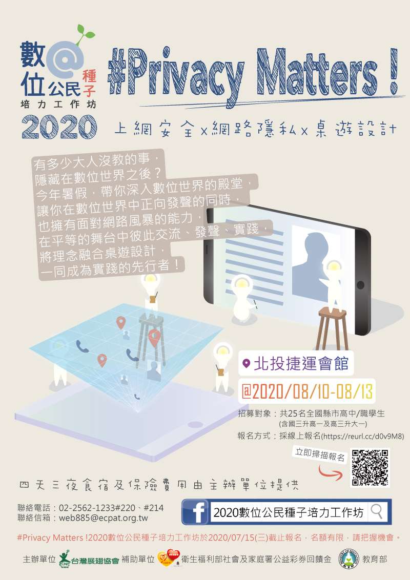 一、兒少不只是網路世界的使用者,同時也擔任了參與者與產出者,兒少的想法應受到重視,為讓兒少了解網路有多樣 面貌,並增進兒少數位公民、上網安全意識,成為積極的 網路行動者,本會於2020年8月10-13日舉辦數位公民種子培力工作坊,工作坊中緊扣著網路「隱私權」為主題,邀請政府、業者、NGO、專家學者們透過專題講座、場次交 流、小組合作以及開放空間討論等方式增強、實踐兒少在 數位世界中的行動力和影響力,一起在工作坊產出一個緊扣著主題的桌遊成品,並具體發揮兒少影響力,推動與實 踐數位公民意識,讓兒少相互影響,推己及人,提升兒少對網路公共事務的參與。