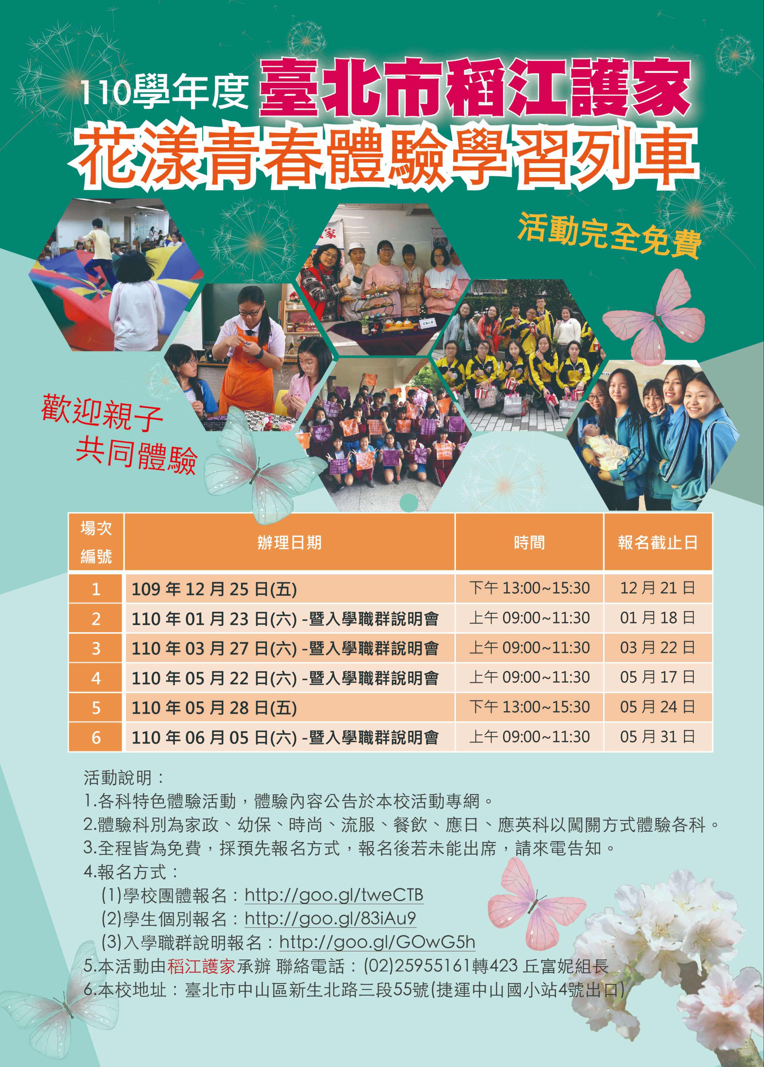 一、為協助國中學生了解職校群科特色,以依性向及能力選擇適性類型及群科,稻江護家特別規劃相關活動,配合學校生涯發展教育及職業試探課程。