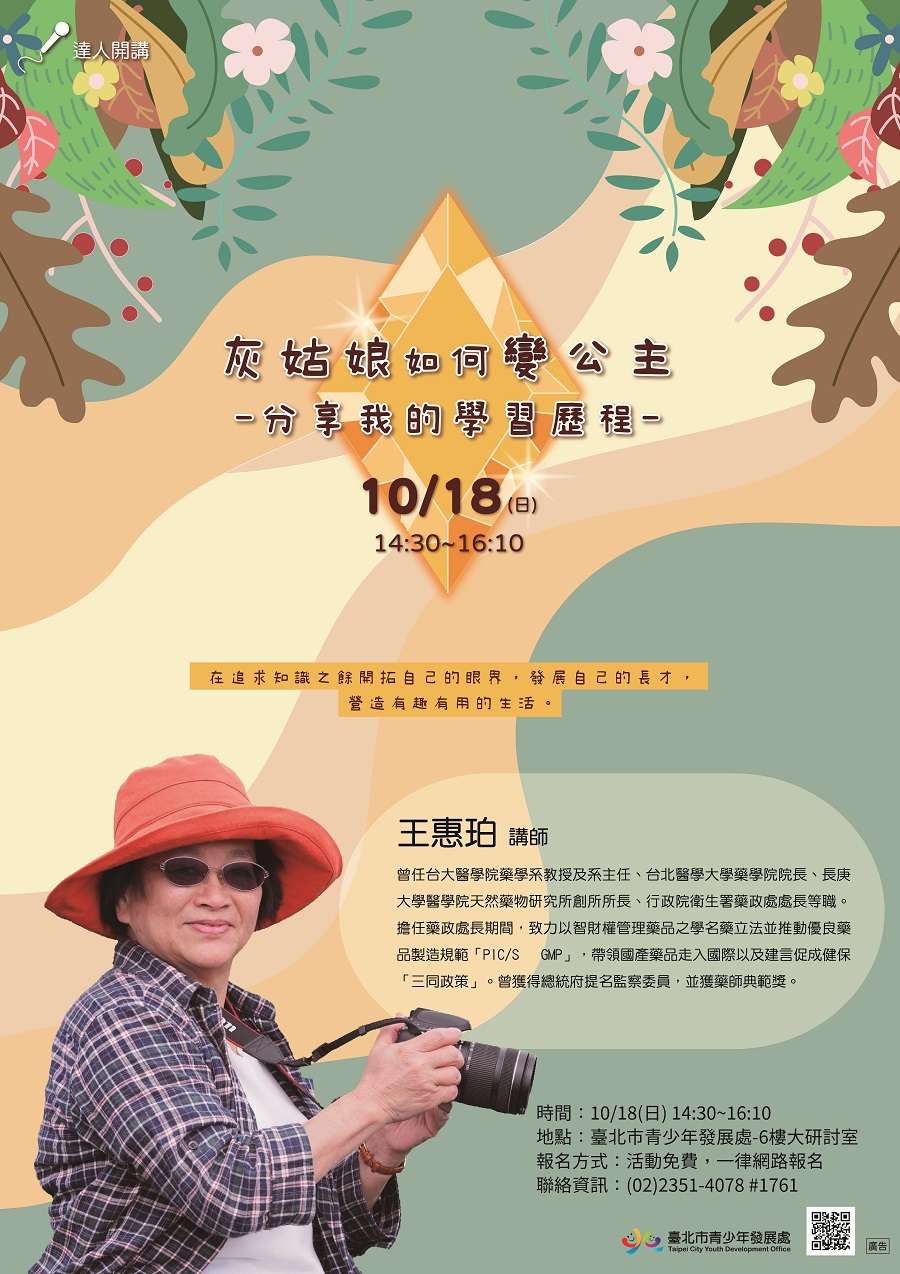 一、本活動目的為經由講師職涯經驗分享,讓年輕學子認識各行各業,藉以了解自身興趣及性向,進而找到未來的道路 與建立自我價值;此次講座特邀「醫藥界的雪中梅花」王惠珀教授,藥學博士王教授曾獲15國41項新藥發明專利以及「藥師典範獎」、「國家發明獎」等獎項,「宏觀入世」是她的座右銘、「以人為本」是她的理念,這次的講座將用「灰姑娘如何變公主」的故事談談她走過的路,以古今中外的經典故事與年輕朋友分享其人生態度以及快意一生的學習過程,並告訴青年學子如何治學,讓自己成為有宏觀境界的知識分子,營造一個有趣有用的入世生活。