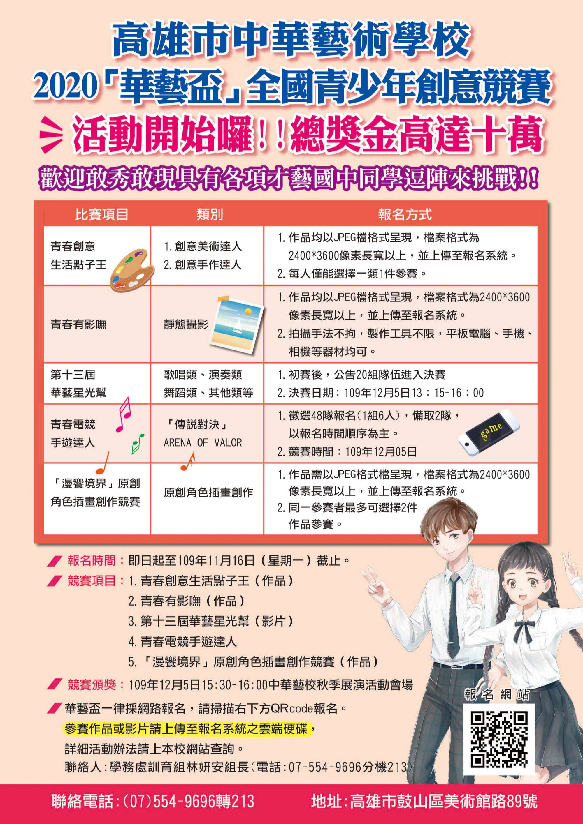 一、高雄市私立中華高級藝術職業學校提供青少年一個創意發想平台,讓獨具創意互相激 盪、點子相互揮映,讓創意的藝術種子深植於青少年的心 靈及日常生活當中,並且推動藝術跨域計畫,舉辦青少年 才藝競賽,提供校外青少年展演舞台,以實現真正「創意 不離手、藝術帶著走」的藝術價值。