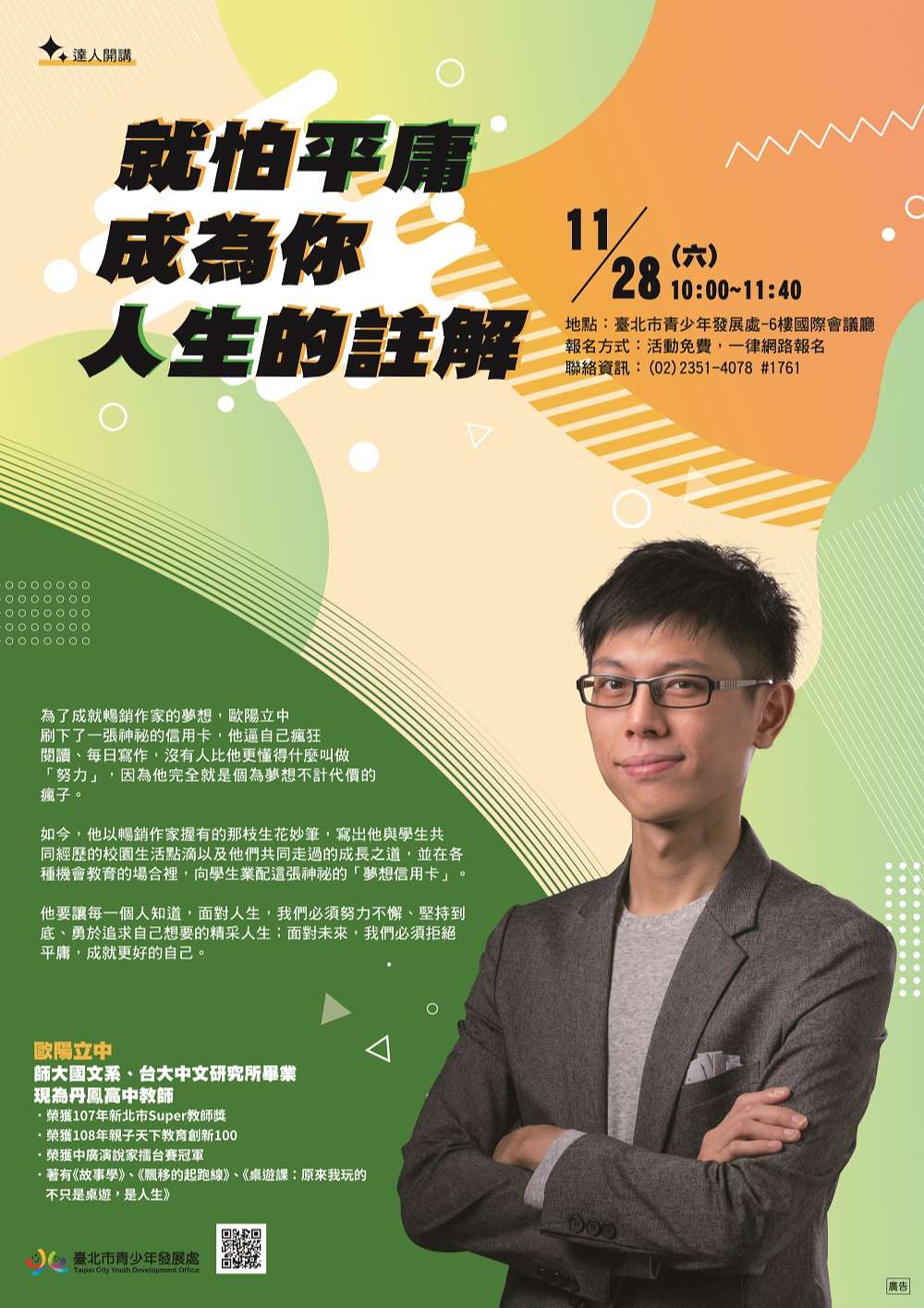 一、本活動目的為經由講師職涯經驗分享,讓年輕學子認識各行各業,藉以了解自身興趣及性向,進而找到未來的道路與建立自我價值;此次講座特邀暢銷作家歐陽立中老師, 歐陽立中老師為了成就暢銷作家的夢想,刷下了一張神祕的信用卡,此後為了償還積欠的卡債,他逼自己瘋狂閱讀、每日寫作,沒有人比他更懂得什麼叫做「努力」,因為他完全就是個為夢想不計代價的瘋子,歐陽立中老師這次要告訴大家如何拒絕平庸,成就更好的自己。