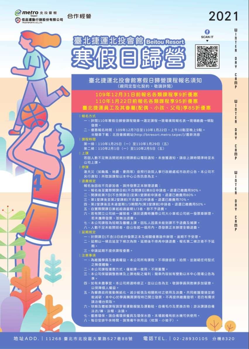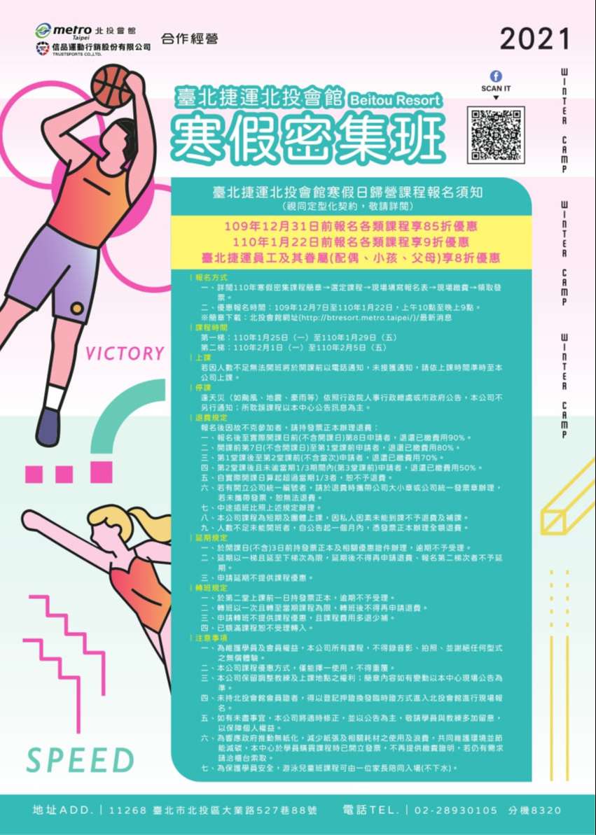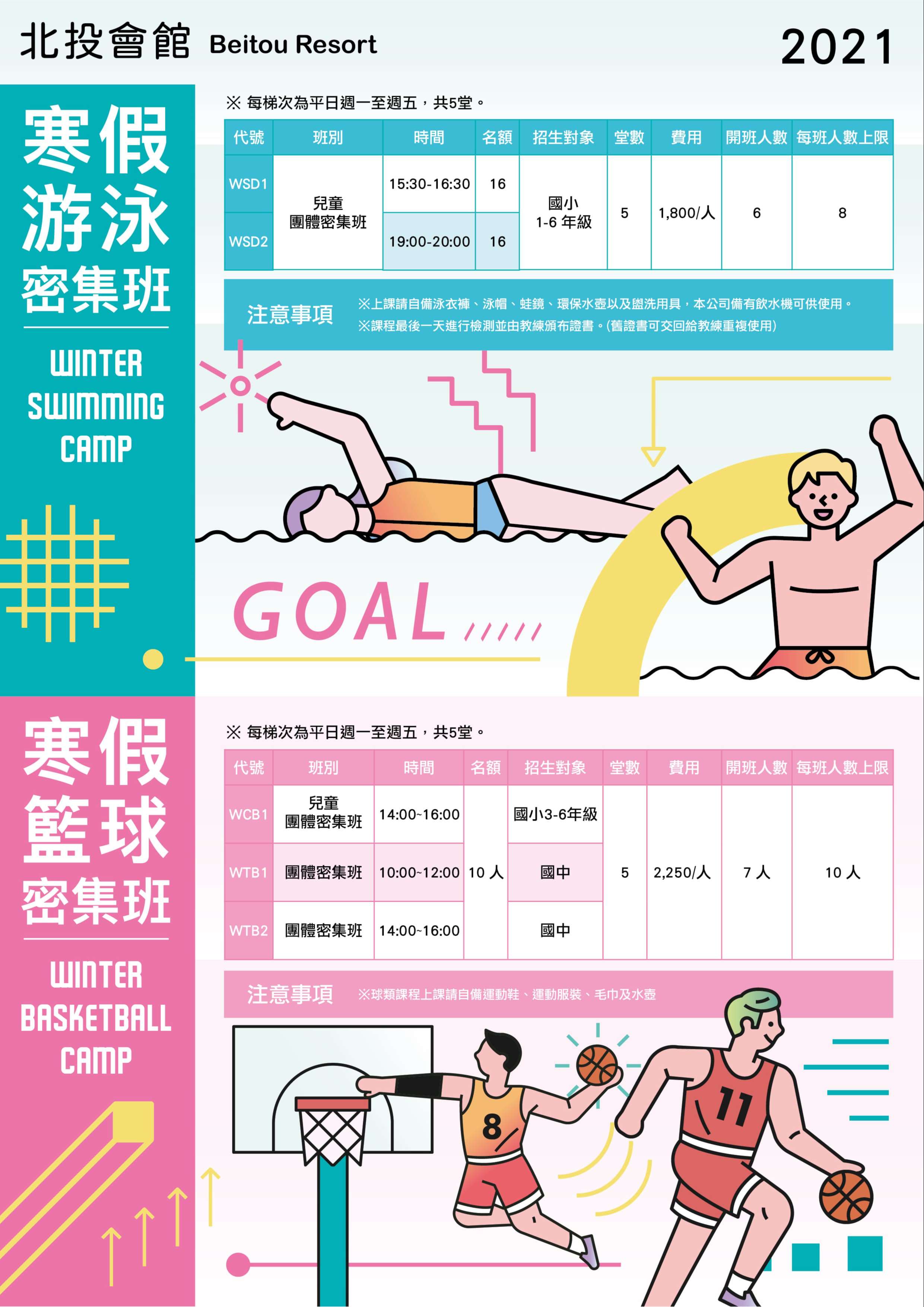 一、北投會館與專業團隊合作開辦豐富多樣性的寒假營隊活 動,包含籃球、流行街舞、游泳、體能訓練、創意DIY手作 等課程,名額有限,額滿為止。