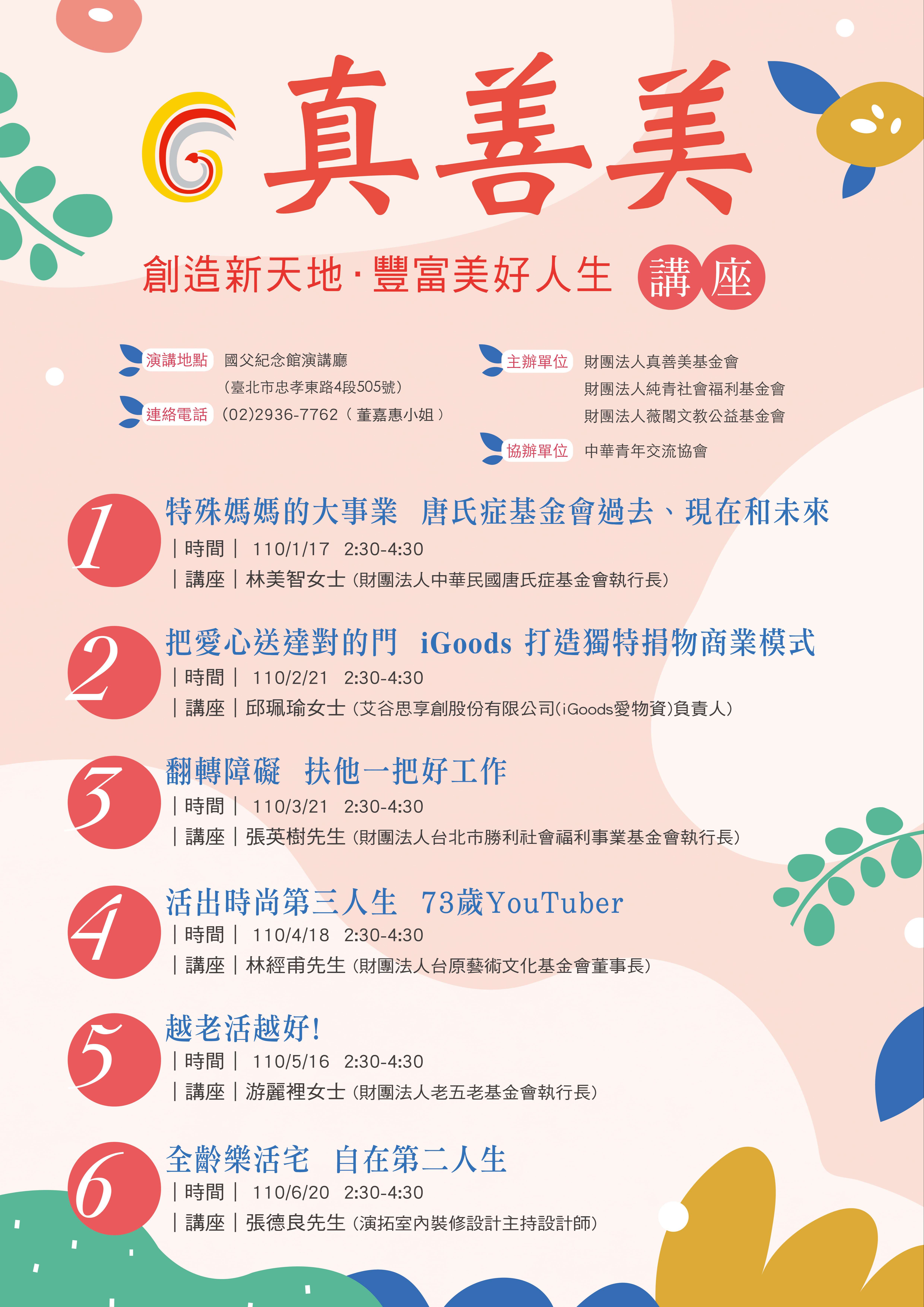 一、本會與國立國父紀念館、財團法人純青社會福利基金會、 財團法人薇閣文教公益基金會共同舉辦「110年度真善美講 座」,講座主題為「創造新天地 豐富美好人生」,歡迎有 興趣者踴躍參加。