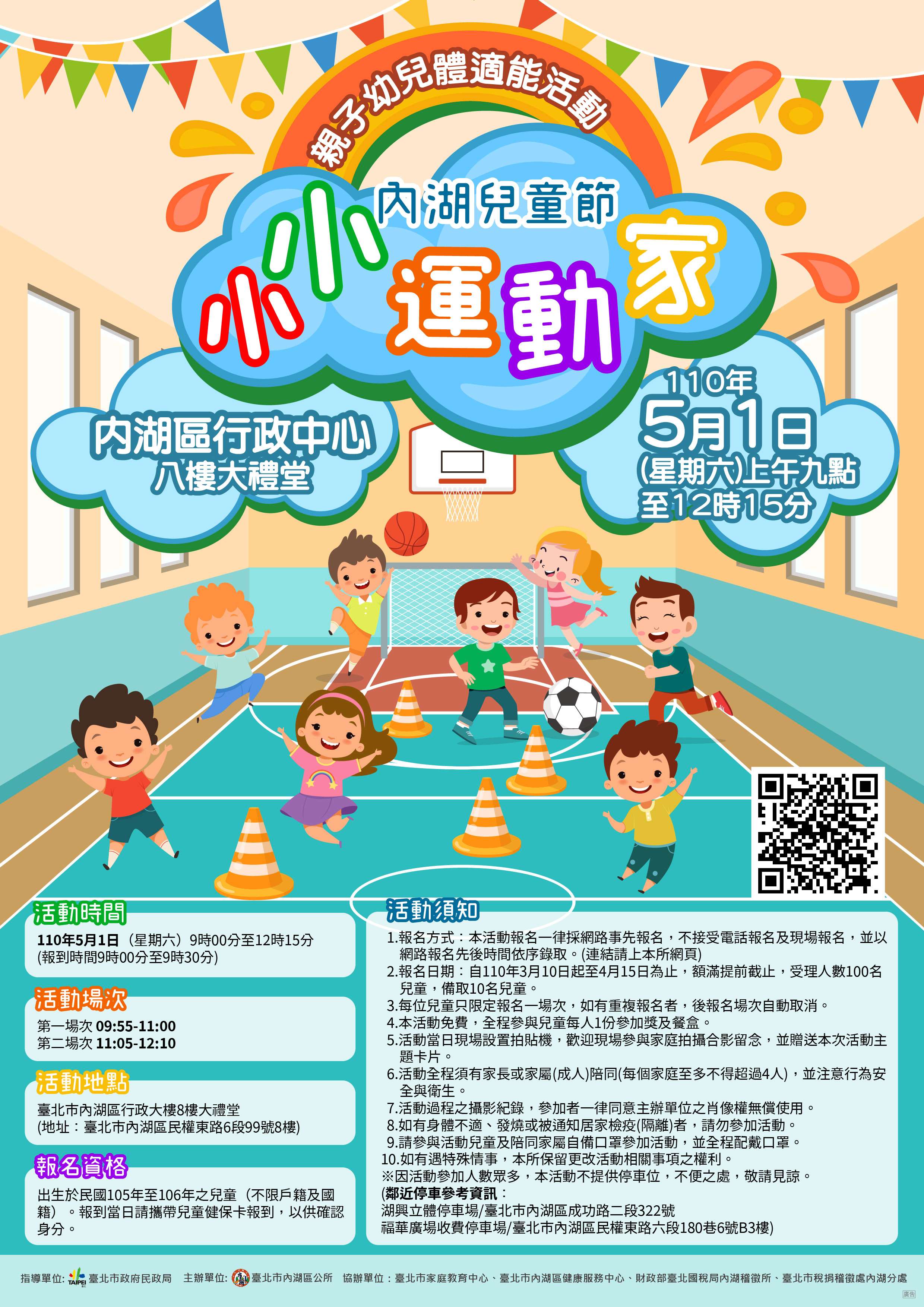 臺北市內湖區公所110年度人口政策宣導活動「內湖兒童節-小小運動家 親子幼兒體適能」,訂於5月1日(星期六)上午9時至12時15分,假臺北市內湖區行政中心8樓大禮堂(臺北市內湖區民權東路6段99號8樓)舉辦,即日起開放報名,正取100名,備取10 名,額滿為止,成功報名並全程參與兒童每人1份參加獎及餐盒,現場設有主題拍貼機免費拍攝留念。(本次活動一律採取網路事先報名,不接受電話報名及現場報名),詳情請參閱內湖區公所網站。