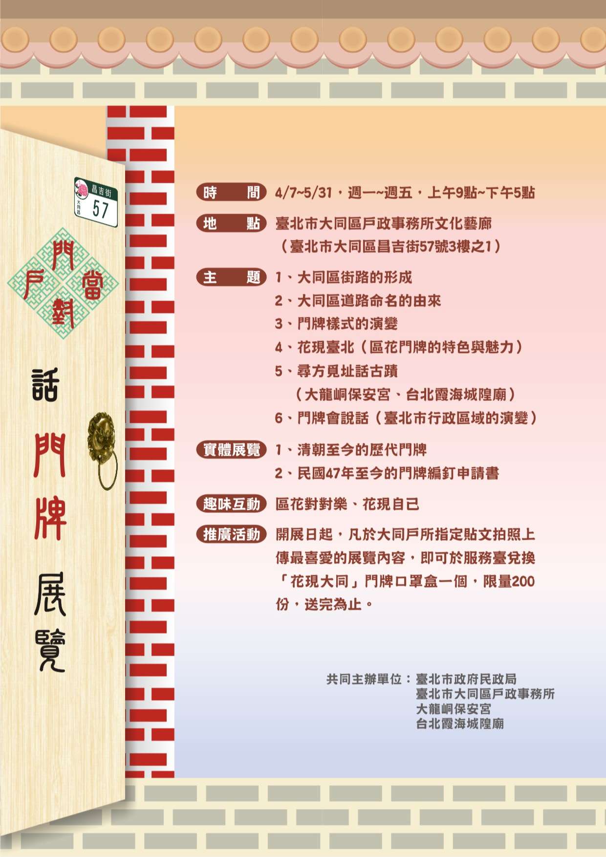 一、依「臺北市政府民政局及各區戶政事務所辦理門牌清查暨 非區花門牌汰換計畫」本市門牌於今(110)年3月31日起 進行汰換,本所特舉辦旨揭展覽活動,細說臺北市門牌的 演變,並邀請民眾從門牌探索臺北市行政區域的變化歷 程。現場並推出「區花對對樂」及「花現自己」趣味互 動,歡迎參觀。