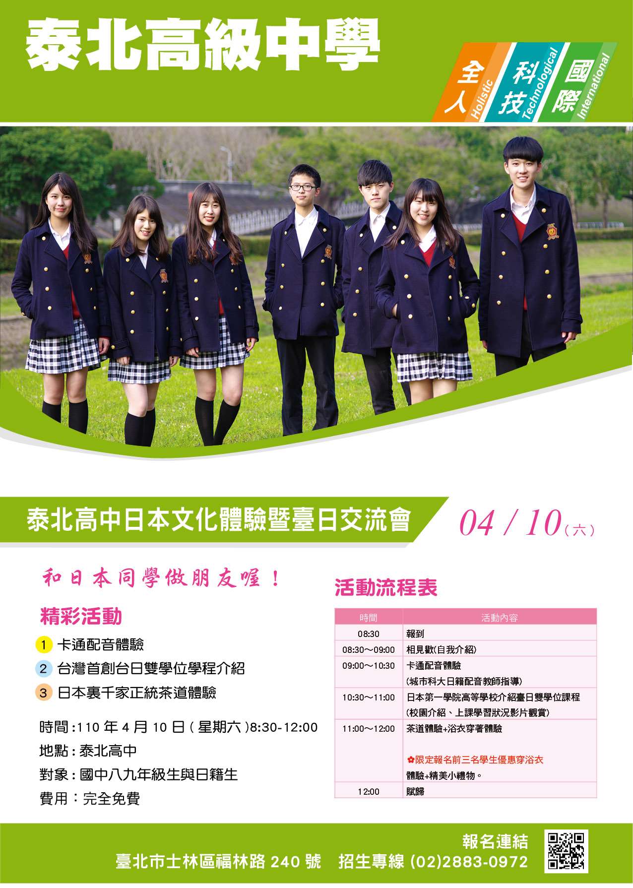 一、為啟發國中生探索技職教育,增進對各職群的認識。泰北高中特於4月10日(星期六)至4月25日(星期日)舉辦「105週年校慶系列-各科精采體驗活動」。