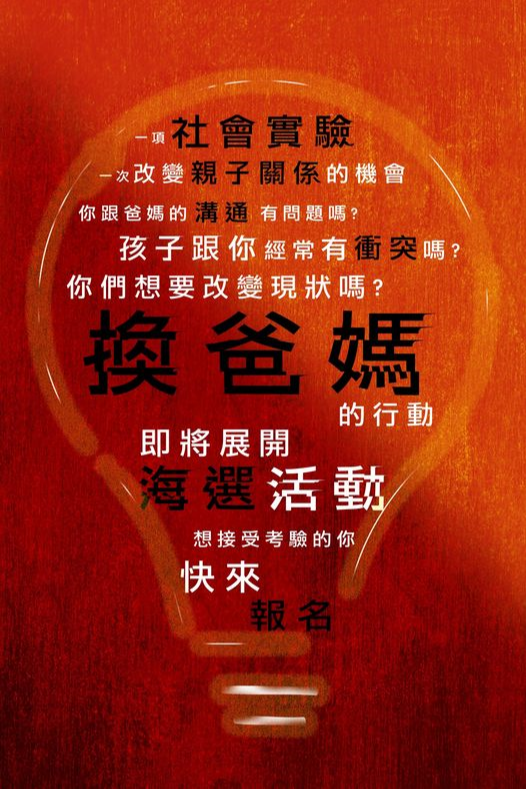 二、換爸媽這可能是一些孩子的心聲,尤其當親子關係發生緊張關係時,這樣的想法可能會逃竄出來,而爸媽也常常聽 到小孩埋怨說別人的爸媽比較好,面對這樣的埋怨,爸媽也很無奈、甚至苦無量法改善,此節目欲進行一次大膽的社會實驗,將換爸媽的心聲轉換成實際行動---讓小朋友短暫離開家,去別人家當小孩,爸媽也暫時脫離跟孩子的緊張關係。公視誠摯邀約10-18歲的同學們參與『換爸媽』社會實驗的徵選活動。