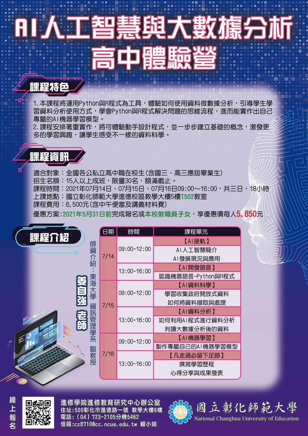 課程時間:110年7月14~16日9:00-16:00,共3日,合計18小時,課程費用每人5,850元(含中午便當及講義材料費),即日起受理報名至110年6月27日(星期日)為止