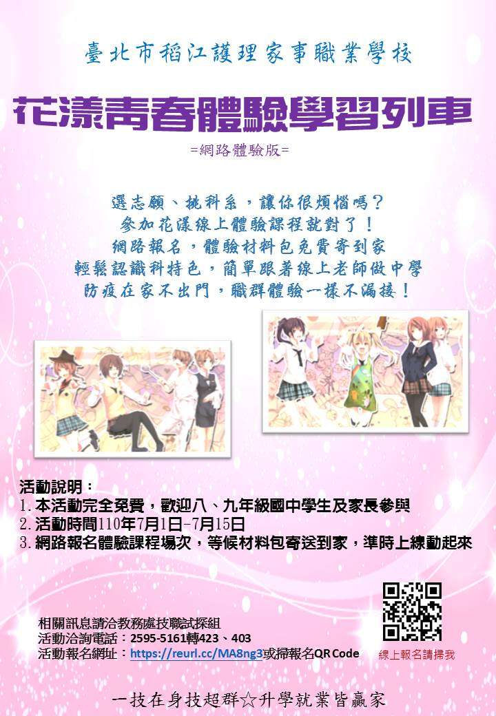 一、為協助國中學生了解職校群科特色,以依性向及能力選擇適性類型及群科,稻江護家特別規劃相關活動,俾配合 貴校生涯發展教育及職業試探課程。