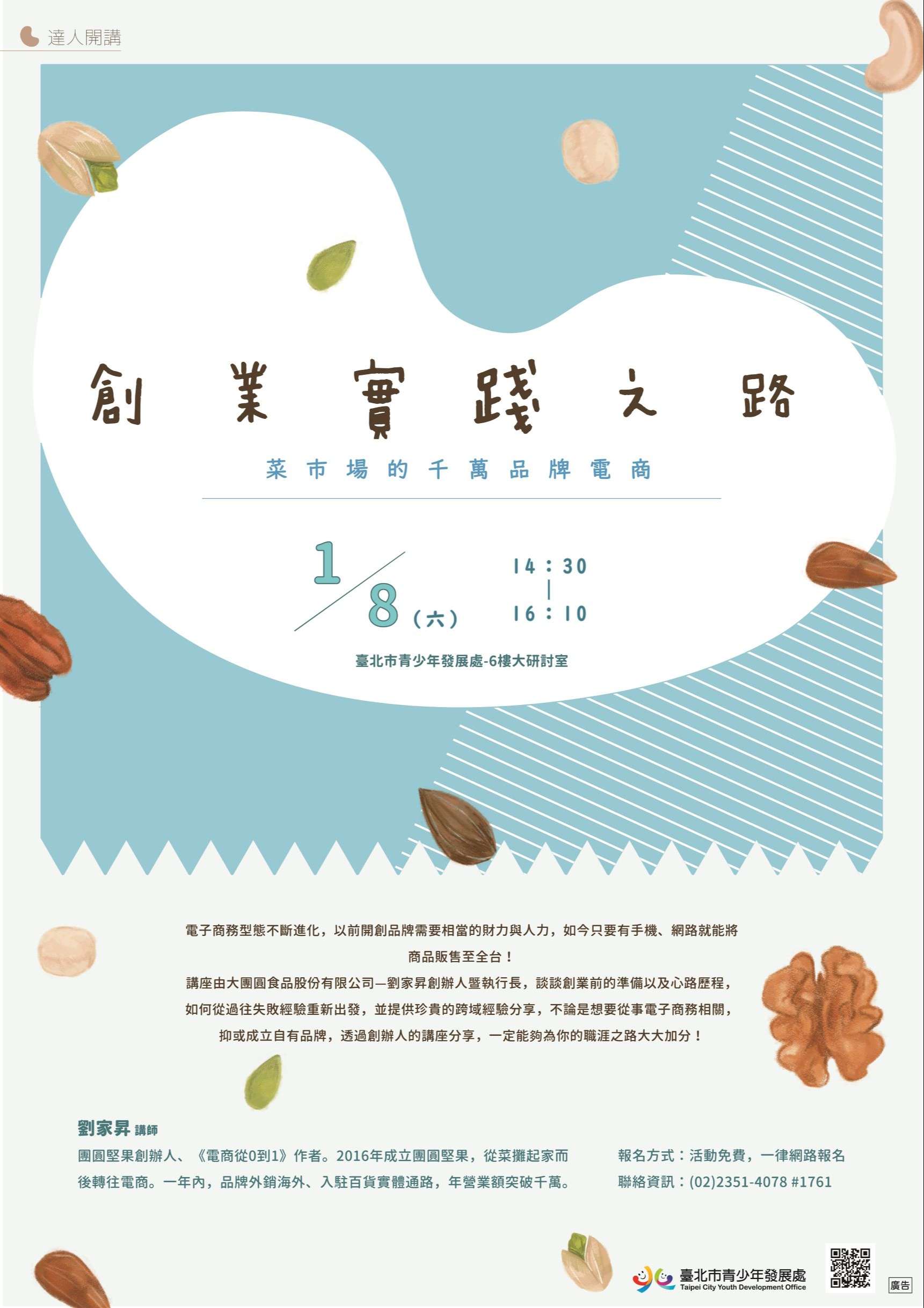 一、經由講師職涯經驗分享,讓年輕學子認識各行各業,藉以了解自身興趣及性向,進而找到未來的道路與建立自我價 值;團圓堅果創辦人劉家昇老師帶您初探電商的真實面貌。
