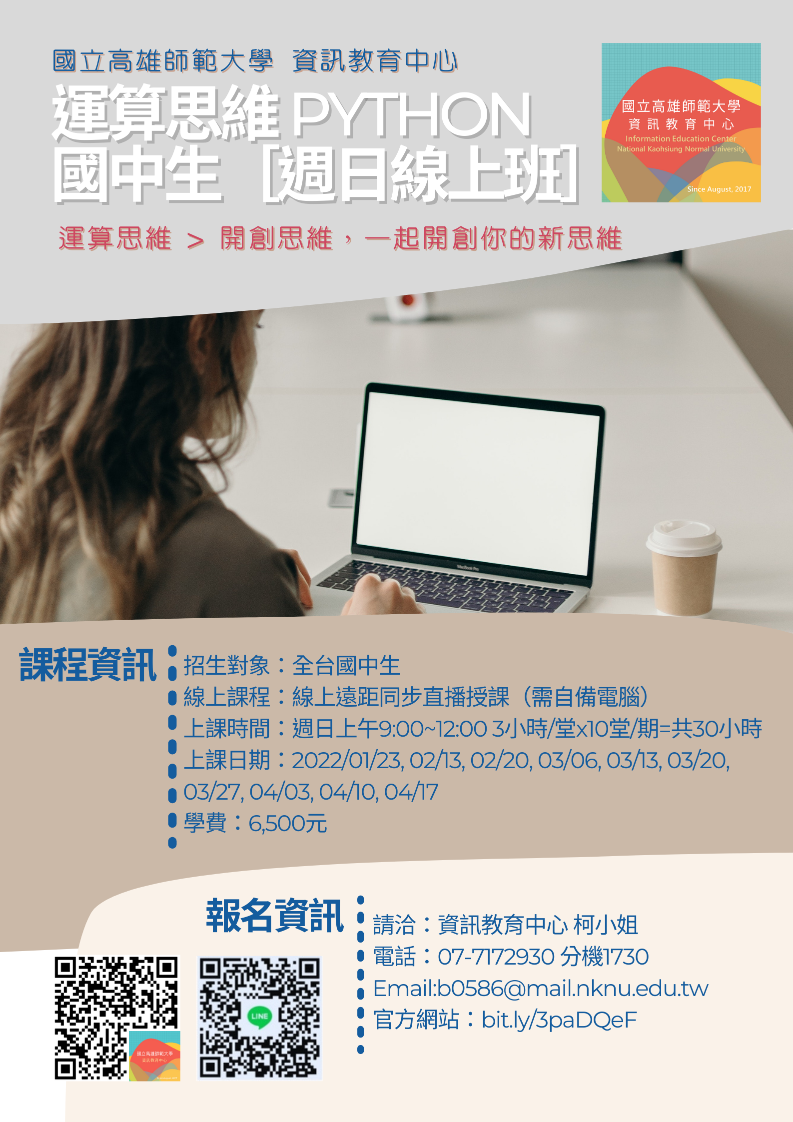 本校資訊教育中心辦理運算思維系列:Python國中生線上 課程,推廣教育招生資訊,即日起開始報名,請協助公告 與轉知貴校學生踴躍參加,請查照。