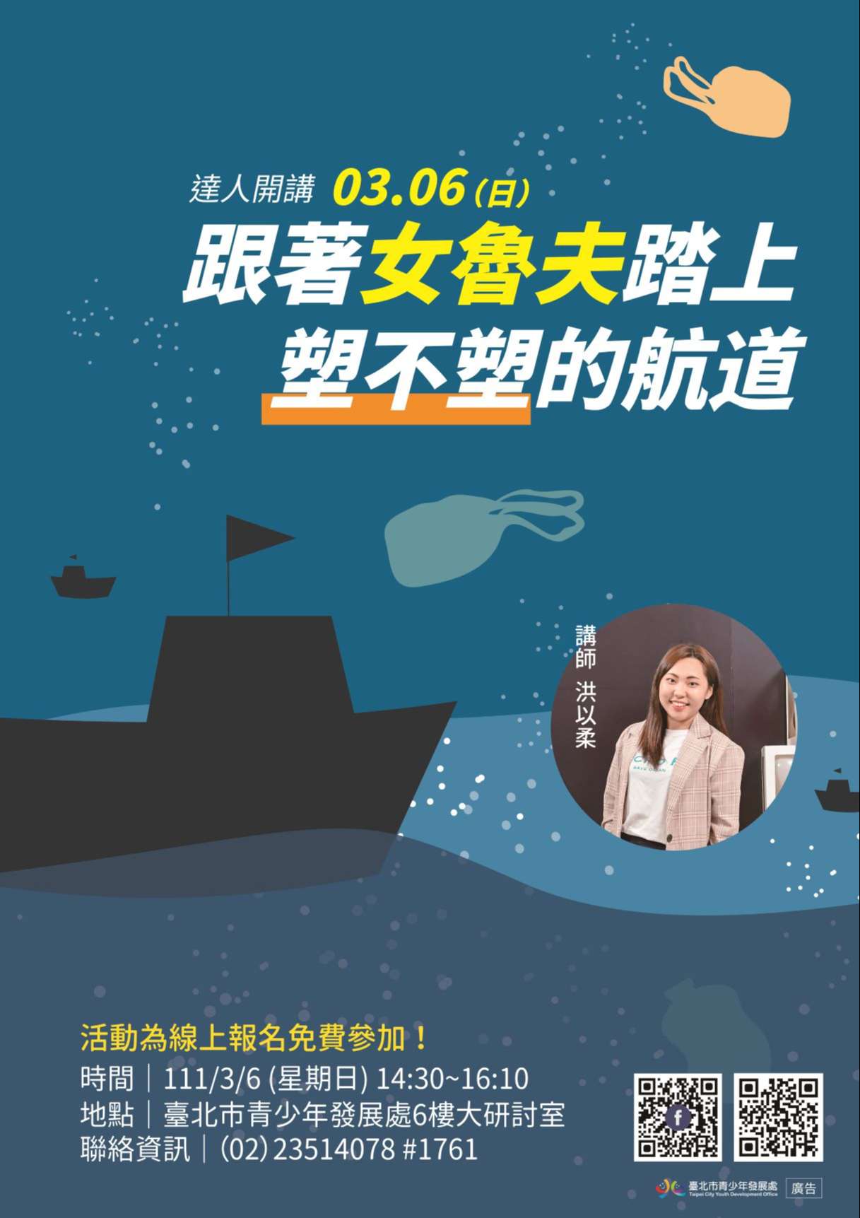 一、經由講師職涯經驗分享,讓年輕學子認識各行各業,藉以了解自身興趣及性向,進而找到未來的道路與建立自我價值;點點塑創辦人洪以柔老師帶您關注塑膠微粒造成的海洋汙染及分享她海洋減塑的歷程。