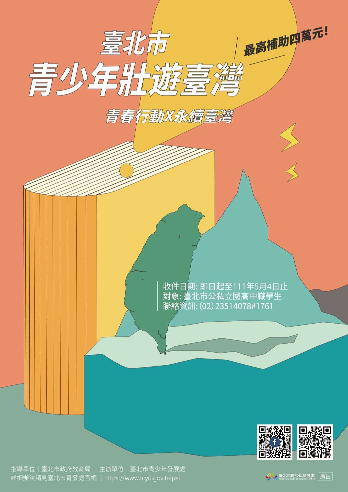 主旨:本處辦理「111年臺北市青少年壯遊臺灣補助計畫」,惠請鼓勵學生踴躍組隊參加,請查照。
