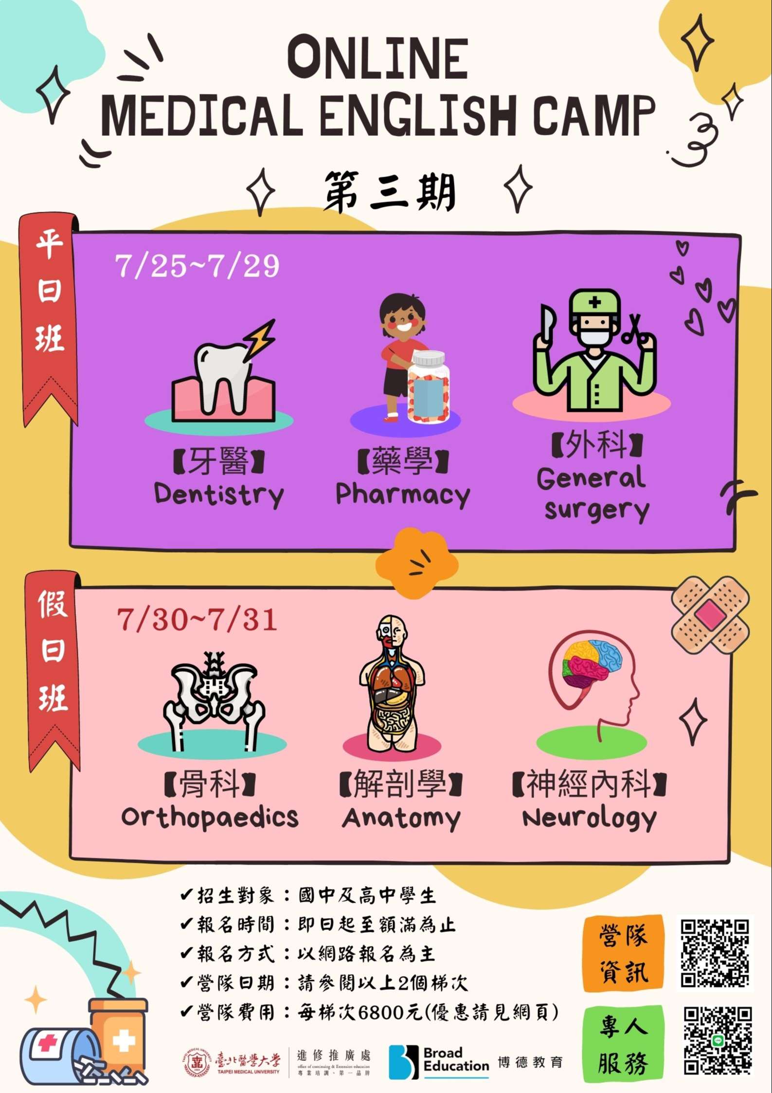 一、本校結合北醫專業醫療師資、國際師資及國際學生的資源,創造英語的環境,讓學童們能藉由營隊期間的各種課程與活動啟發對於醫學領域的興趣,延展對職涯探索的新領域。營隊將於111年7月25日至111年7月31日期間辦理「線上英文醫學營第3期」,總共預定辦理2個梯次的營隊,分別為第1梯平日班7/25~7/29、第2梯假日班7/30~7/31,惠請貴單位協助轉發,並歡迎共襄盛舉。