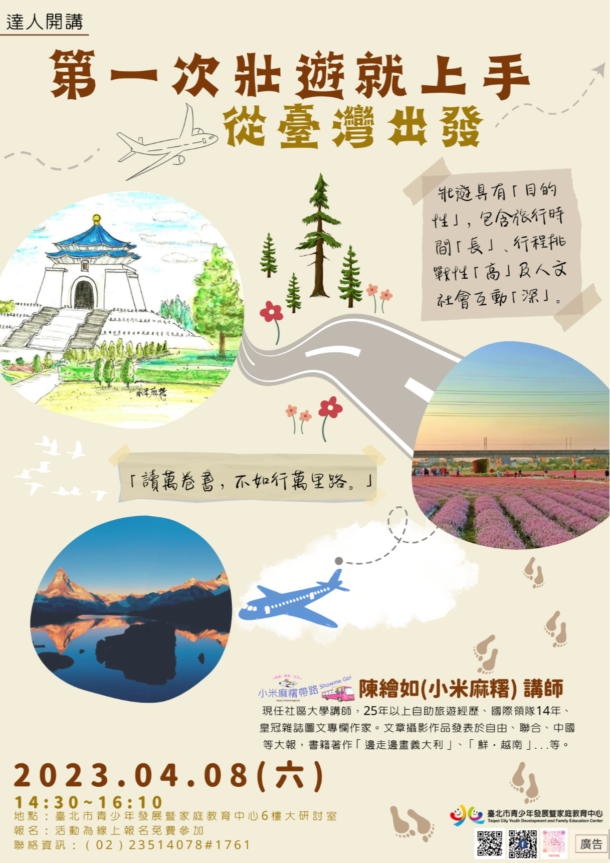 (六)此場為壯遊達人講座,凡申請112年臺北市青少年壯遊臺灣補助計畫團隊參與講座附照片者得加分。