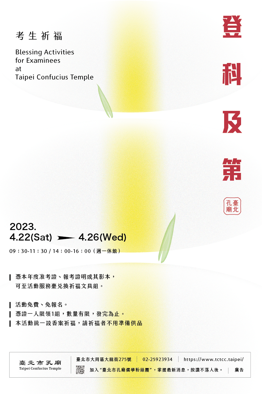一、旨揭活動祈願考生充滿信心迎接考試,參加者可獲得限量祈福文具組,祝福應試順利一舉高中。活動資訊如下: