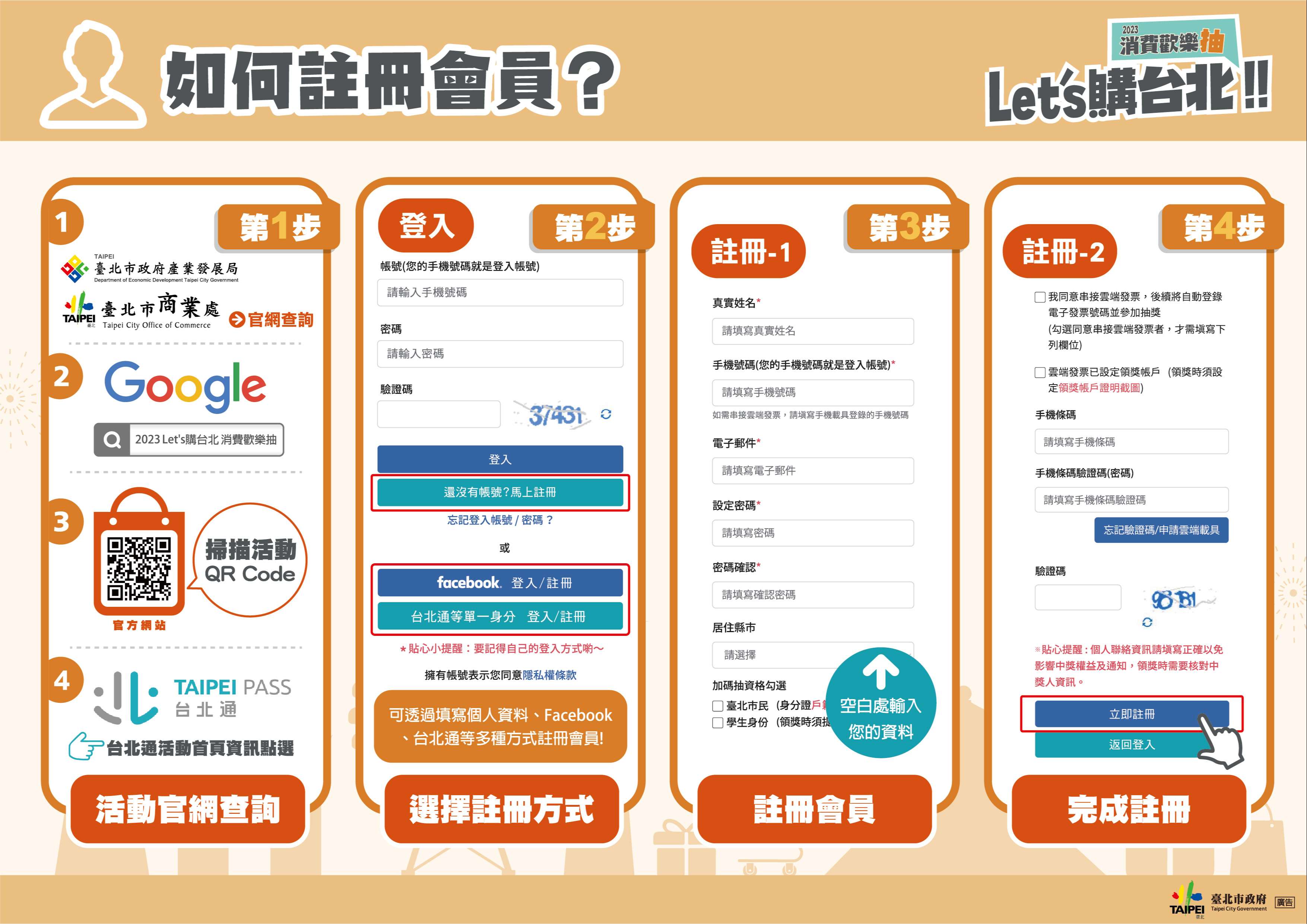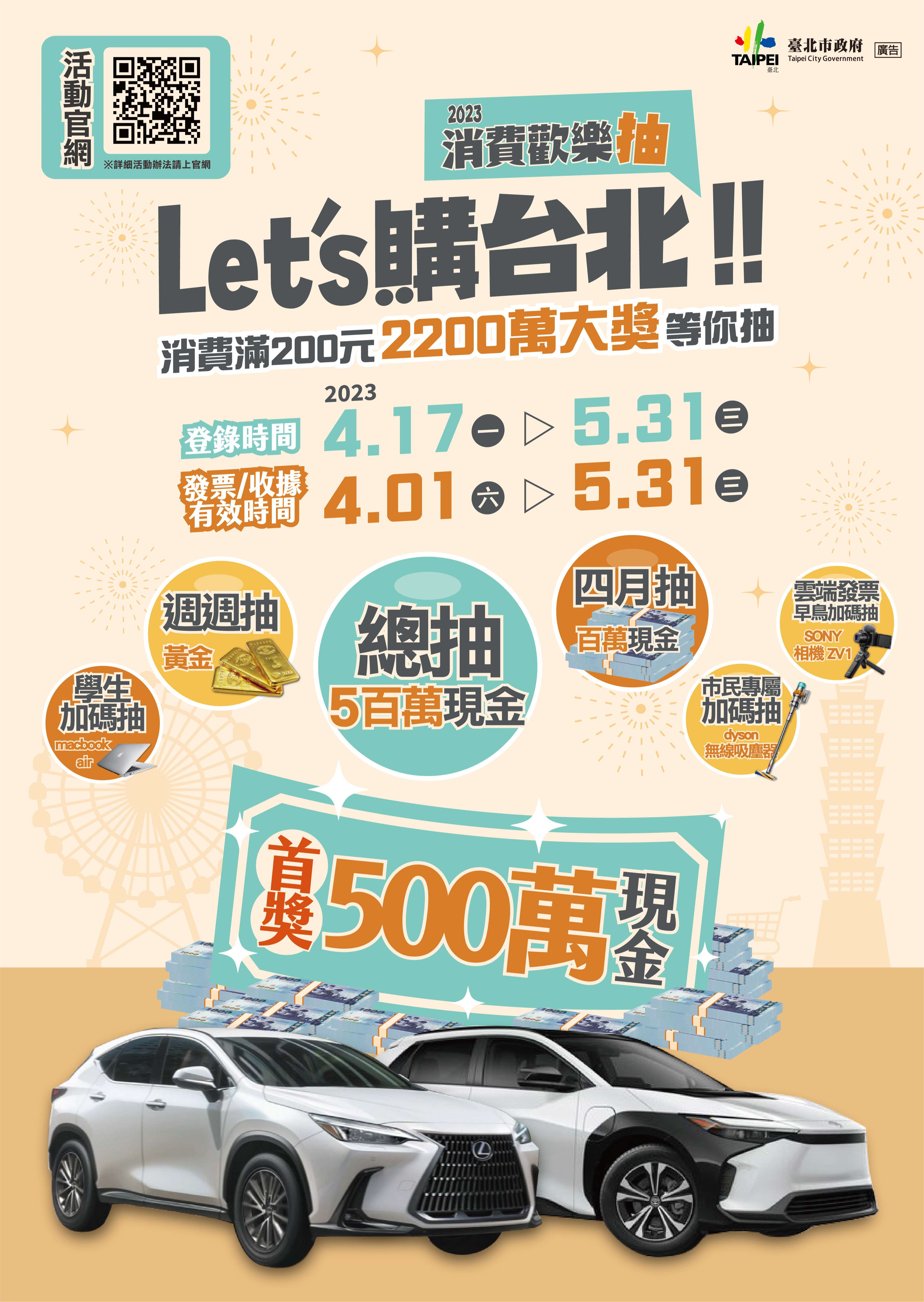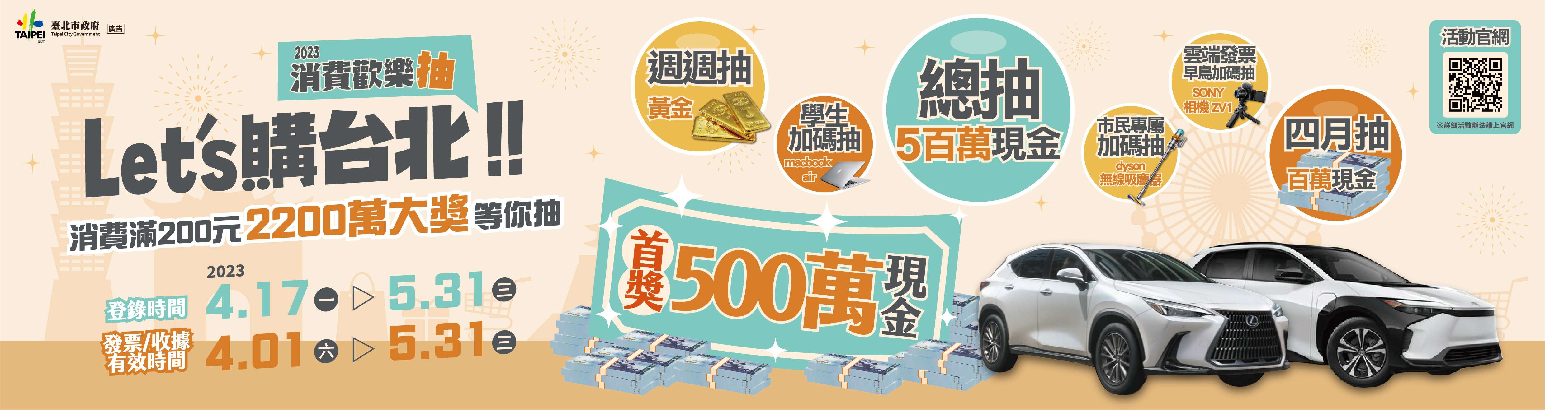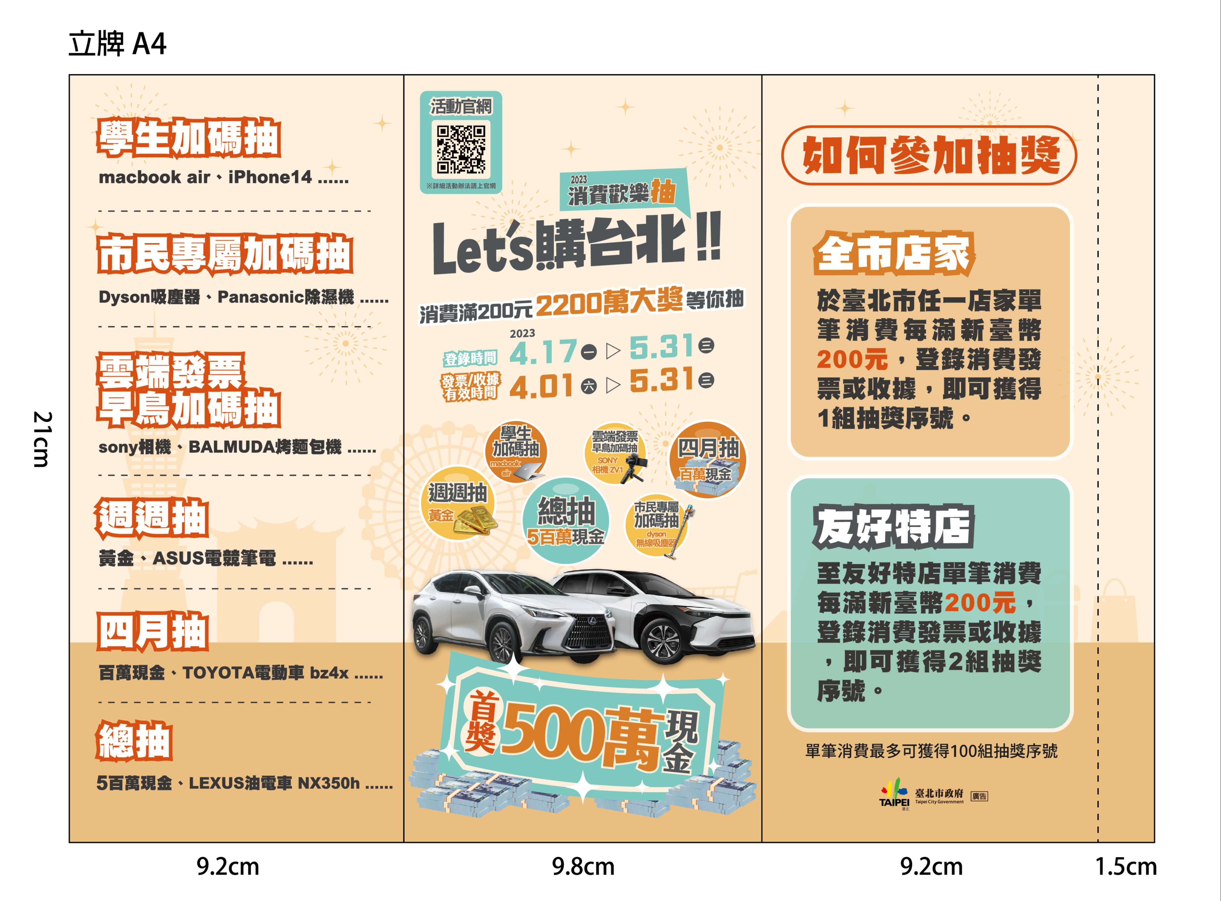 一、依據臺北市商業處112年4月14日北市商三字第1126012315 號函辦理。 二、為響應中央普發新臺幣6,000元之政策,鼓勵民眾於臺北消 費,本府自112年4月1日至112年5月31日辦理「2023Let's 購台北消費歡樂抽」消費抽獎活動,消費登錄週週抽、四 月抽、總抽、學生加碼抽、雲端發票早鳥加碼抽、市民專 屬加碼抽及母親節感恩抽等活動,並透過串聯本市超過 1,000間以上友好特店,整合政府與民間資源共同行銷合 作,以吸引民眾至本市遊逛消費,有效刺激購物,提升整 體買氣,共同活絡本市商業發展。三、為共同推廣本次活動加強宣傳效益,檢附本活動消費抽獎 機制、主視覺、活動海報、懶人包(註冊及登錄)、立 牌、店家宣傳貼紙、FB橫幅等電子檔各1份,請貴校透過相 關管道宣傳露出,詳細資訊請至活動官網查詢 (https://2023letsgotaipei.taipei/)。