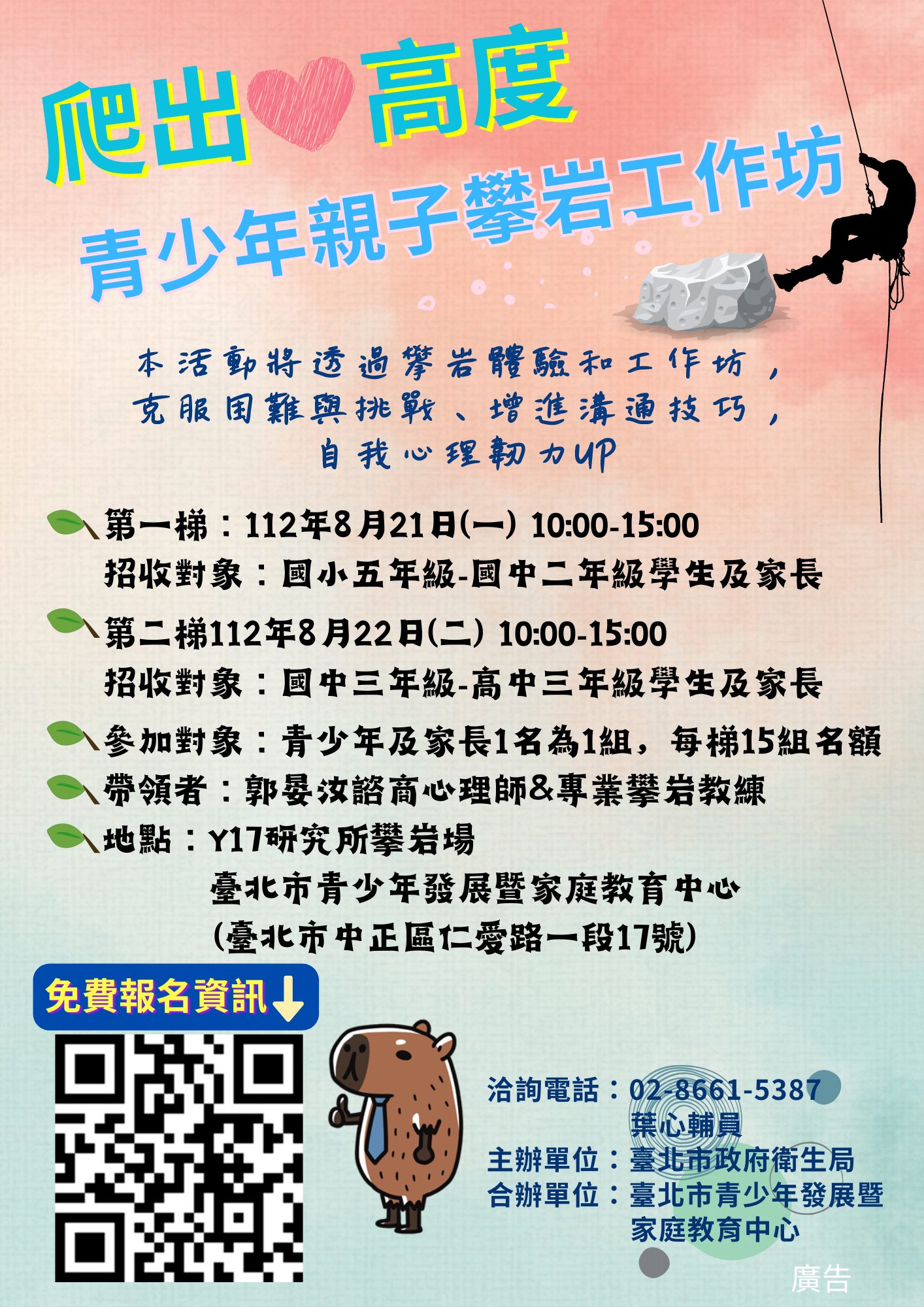 (二)活動地點:臺北市青少年發展暨家庭教育中心9樓攀岩場及6樓中型研討室。