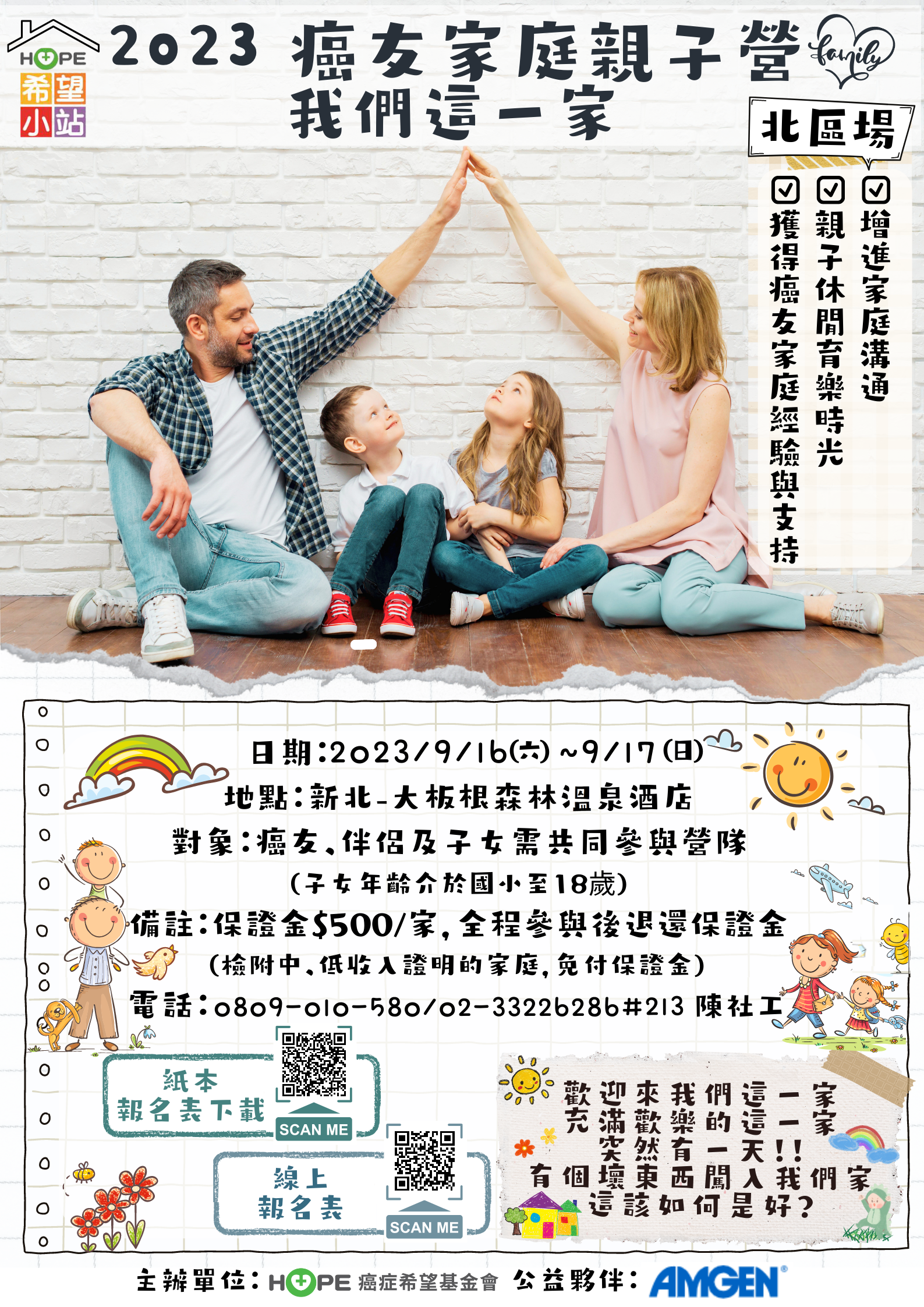 一、藉由親子營,協助罹癌父母理解孩子如何看待癌症,提供親子溝通癌症訊息的平台與管道,增進親子對話的機會。 透過團體引導及討論的方式,促進親子溝通及互動,讓彼此的「愛」得以在家庭中流動。