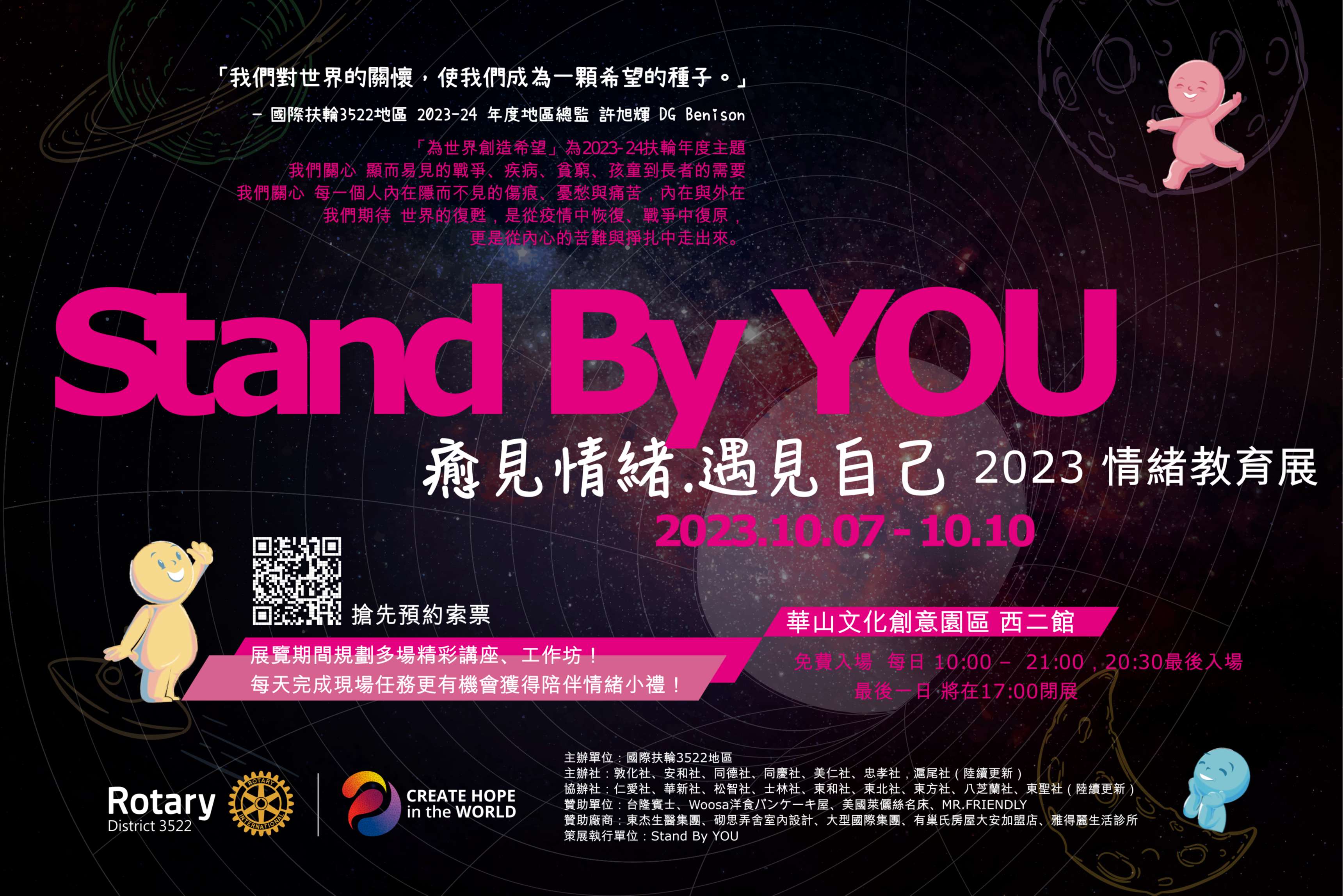 一、國際扶輪社為呼應2023年之年度主題「為世界創造希望」 特聯合民間團體,規劃辦理「療見情緒,遇見自己—2023 Stand By You情緒教育展」系列活動,期以初級預防教育為目的,透過接納與包容,持續關注下一代內在需求議題。
