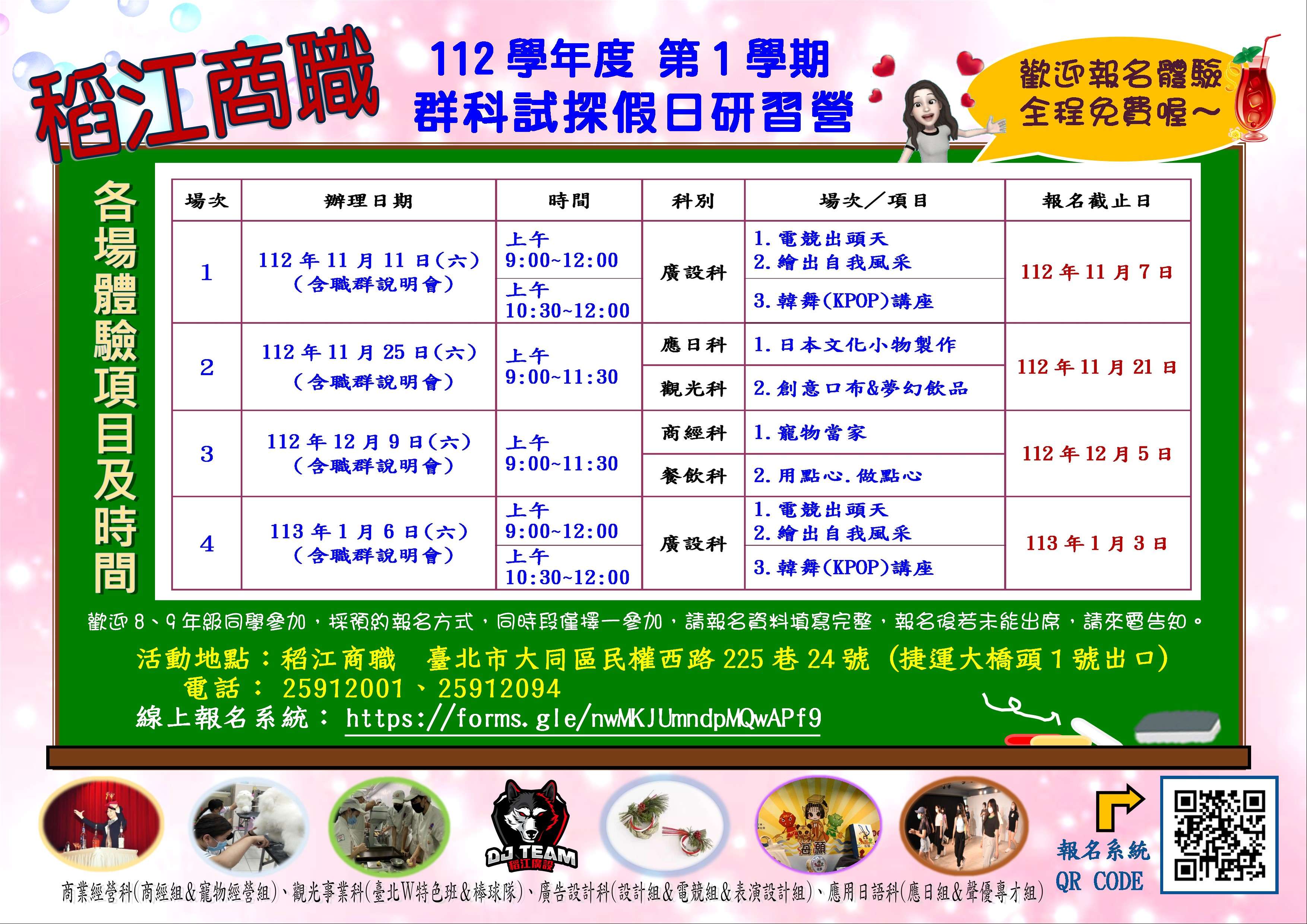 二、為了讓國中學生能對技職學校各群科多元探索,本學期該校辦理4場假日體驗活動及海報,如附件1、2,歡迎國中生踴躍至該校線上報名https://forms. gle/nwMKJUmndpMQwAPf9,參加體驗,活動全程免費。