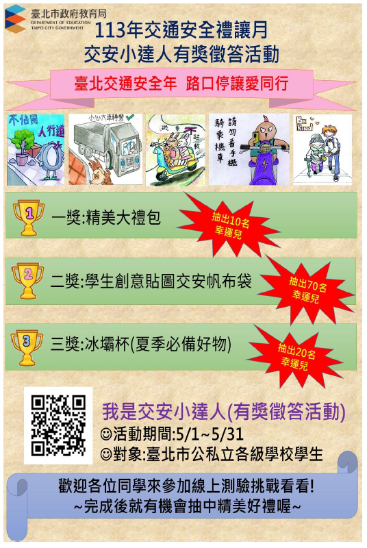 2. 活動方式:鼓勵學生可以參加線上測驗,測驗自己對於交通安全的觀念是否足夠。 本局將採電腦隨機抽獎(測驗滿分者)發送交通安全精美宣導品。