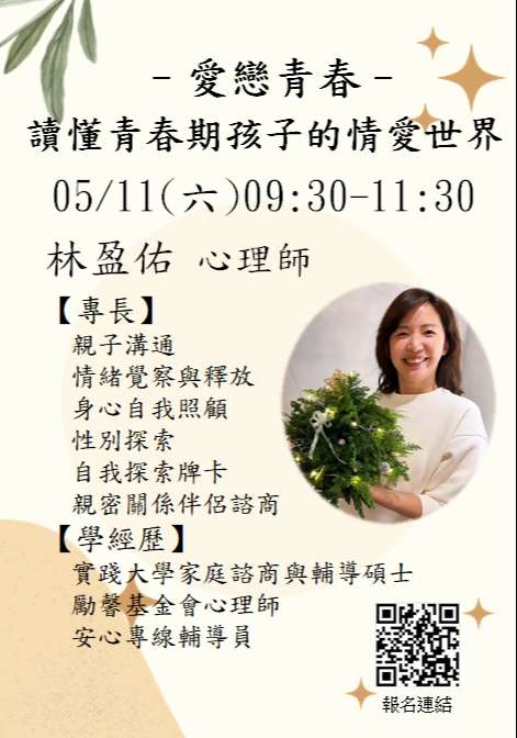 (一) 05/11(六)09:30-11:30,《愛戀青春 讀懂青春期孩子