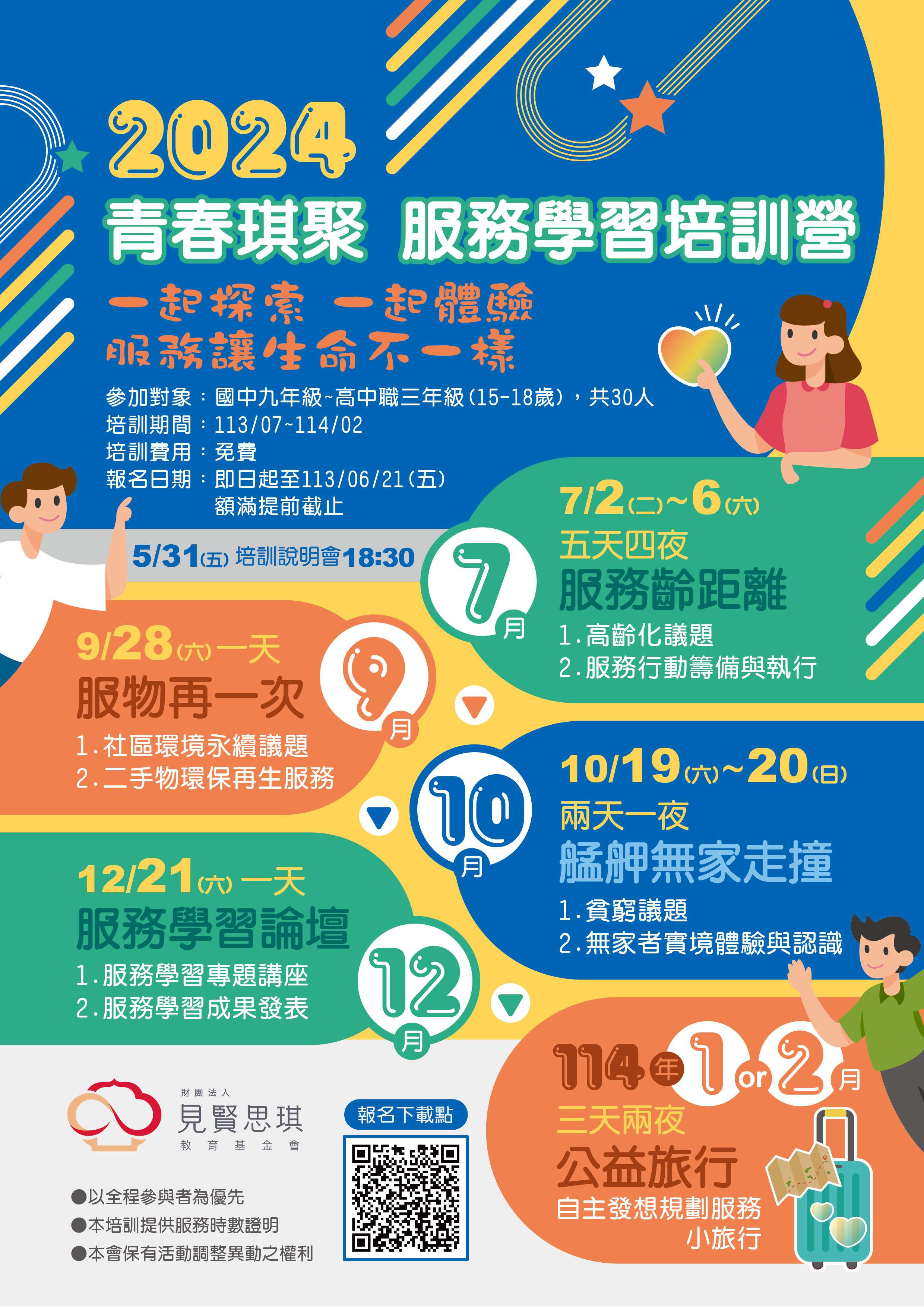 一、本會規劃辦理『2024青春琪聚-服務學習培訓營』,透過系 列性營隊使青少年做中學,並提供社會參與機會,增進青 少年對公共議題的認識,豐富其學習視野,歡迎有服務熱 忱的青少年踴躍參與。