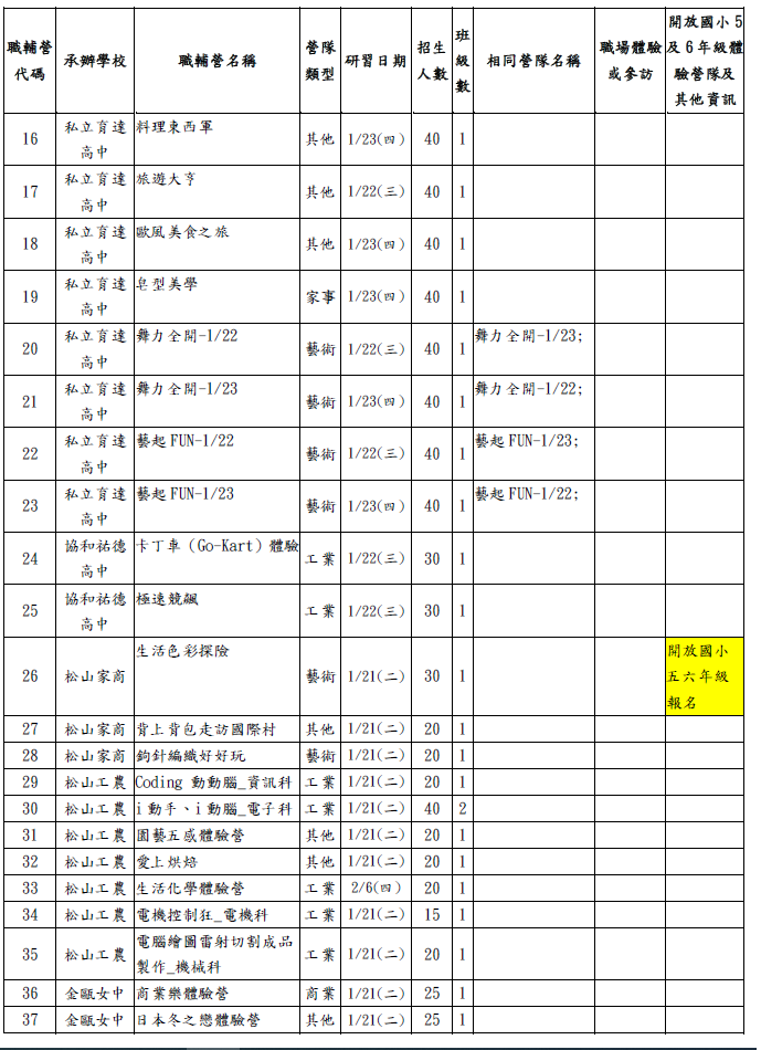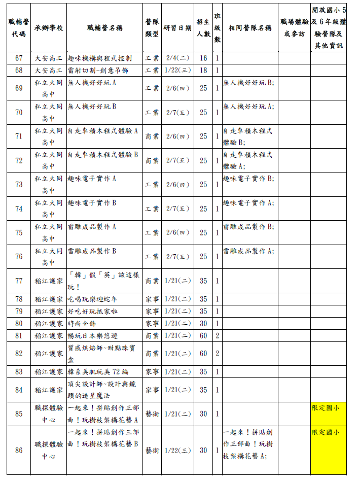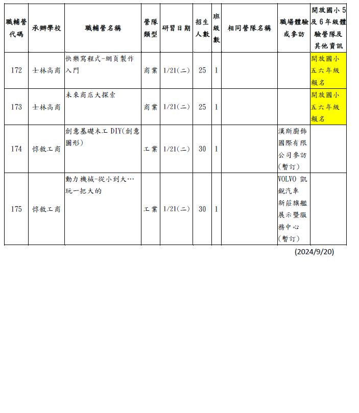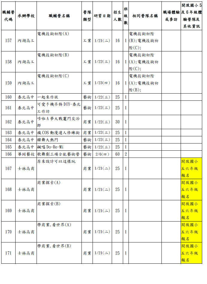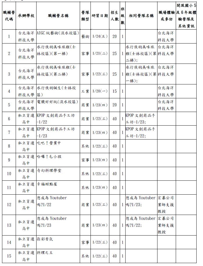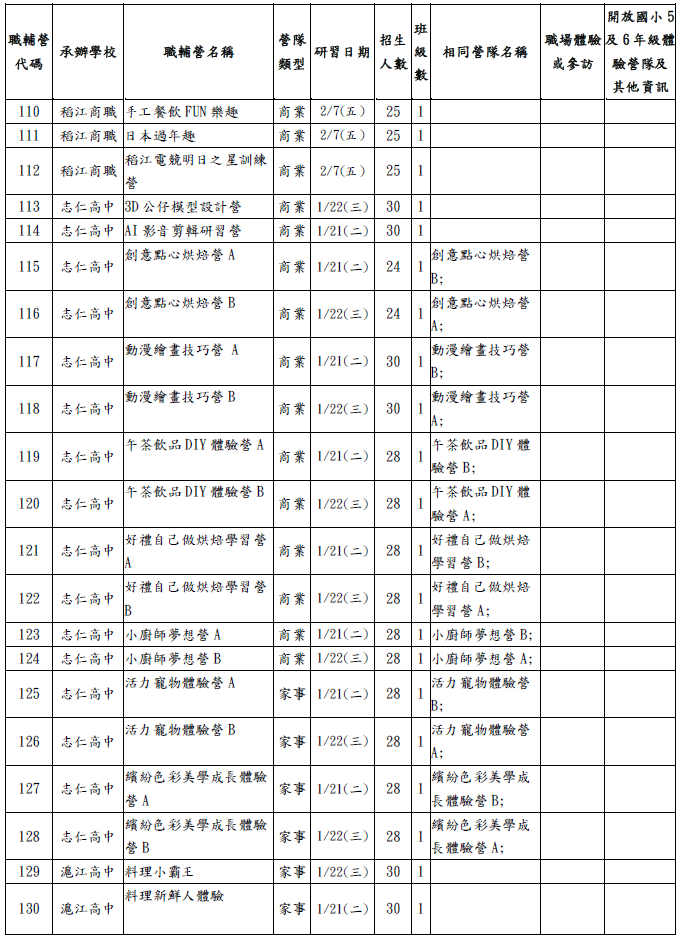 「臺北市114年寒假國中生職業輔導研習營」共開辦175個營隊(臺北市公私立高中職及職探體驗中心共同開辦),參閱附件資料