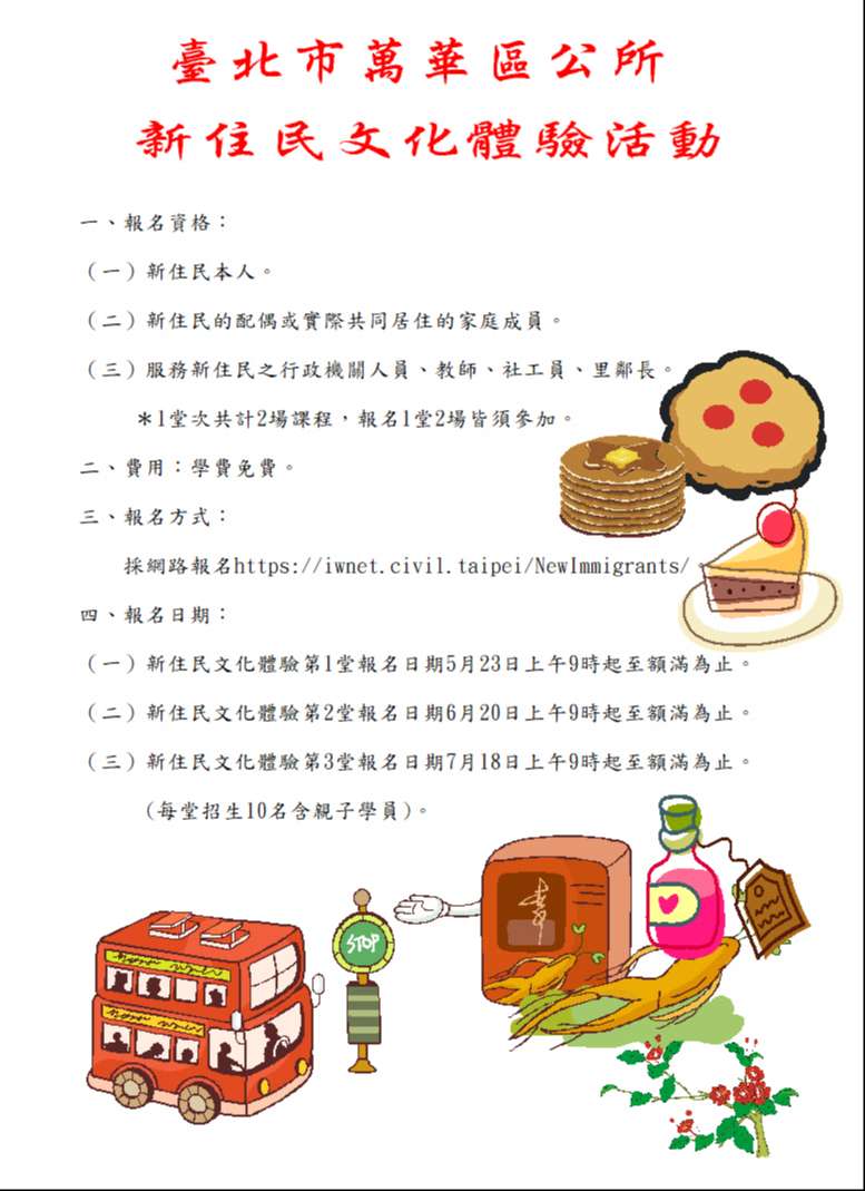 三、報名:114年5月23日起,報名網址:https://iwnet. civil.taipei/NewImmigrants/。