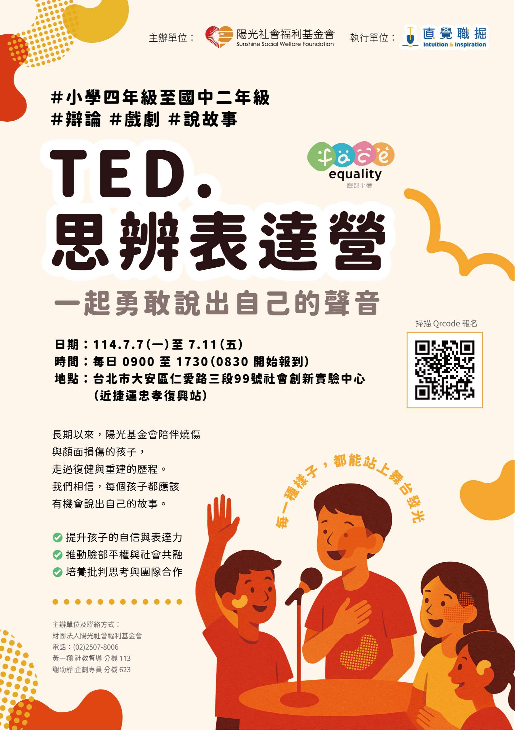 一、活動目的:為使兒少能更關注日常生活中與自己、與他人相關的事物,不僅更願意表達,且能自在說出自己的想法,建立其自信、表達力與同理心,故以思辨訓練結合戲劇教育,透過小組討論、辯論演練、街訪實作與舞台發表,引導兒少勇敢發聲、理解多元,並從中認識容貌焦慮與外貌歧視等議題。