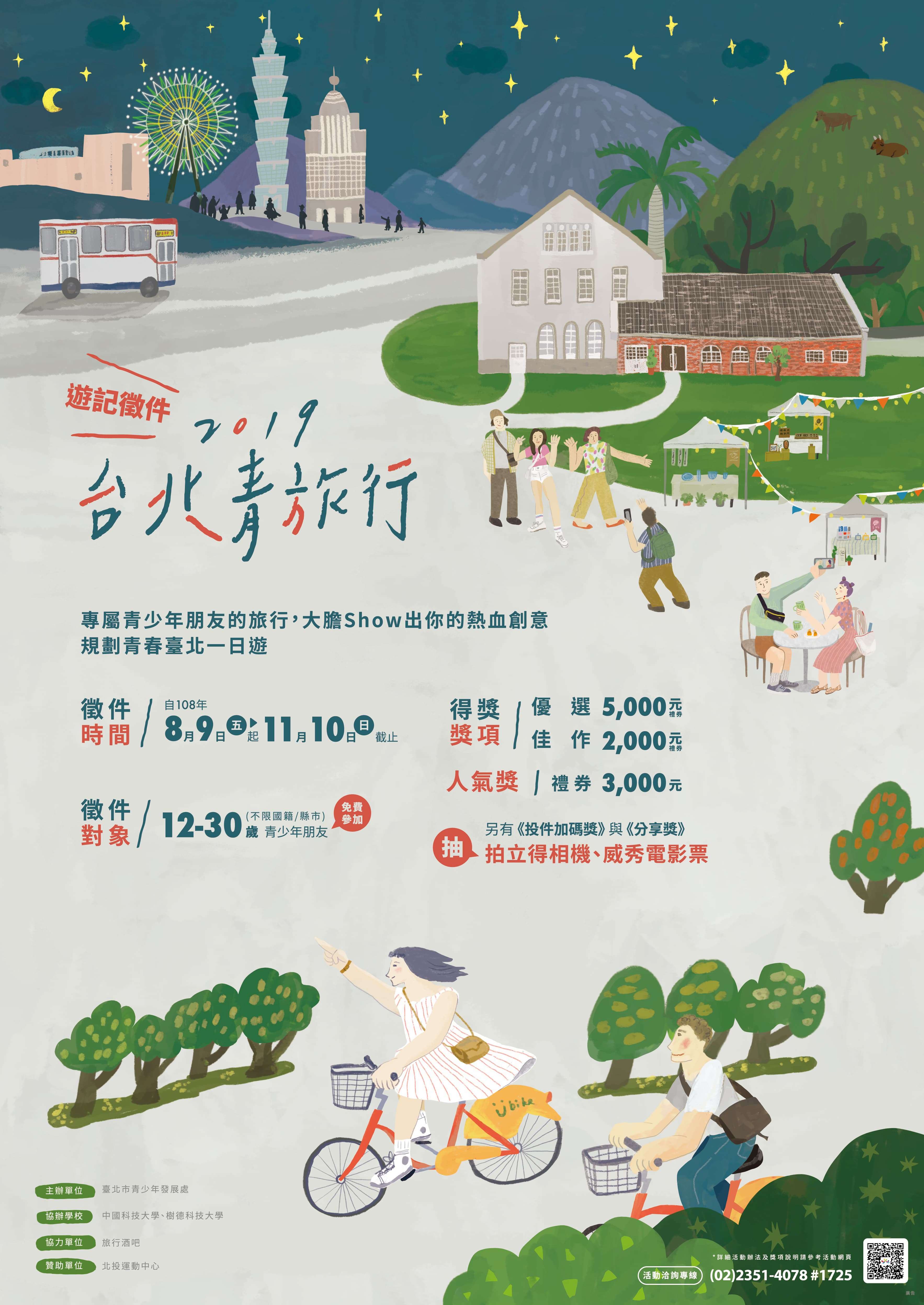 一、為鼓勵青年朋友走出戶外,深度探索人文與美景,規劃一 趟值得在自己青春扉頁記上一筆的豐富旅程,特規劃2019 台北青旅行遊記徵件競賽活動。