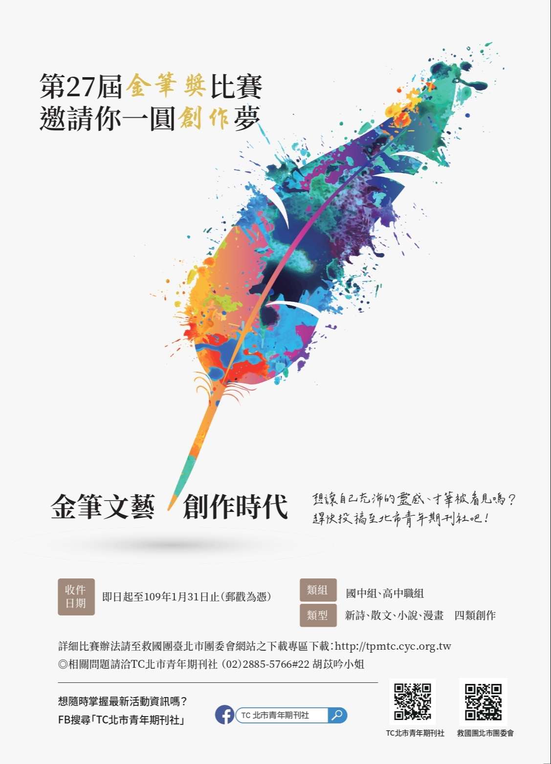 二、金筆獎創作比賽歷經27年,耕耘有成,茲係為倡導青年學 生寫作風尚,提供校園文藝創作平台,鼓勵青年朋友勇於 恢弘寫作、繪畫才華,提升全民生活美學、涵養,盼請共 同協助推廣,增進校園藝文風氣。