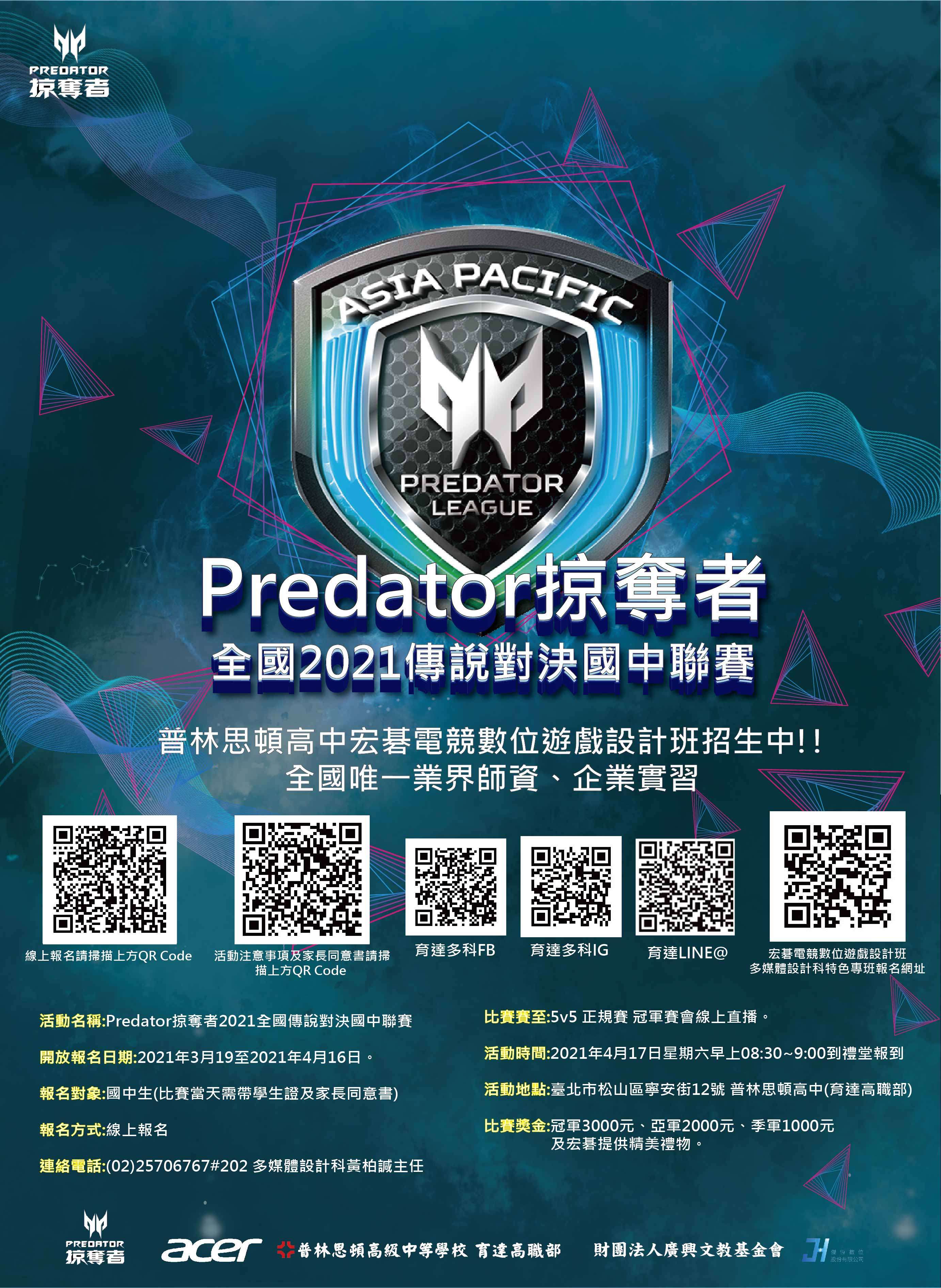 一、宏碁股份有限公司舉辦「Predator掠奪者全國2021傳說對 決國中聯賽」傳說對決電競競賽(辦法如附件一),惠請公 告並鼓勵貴校同學對電競有興趣者踴躍報名參與。