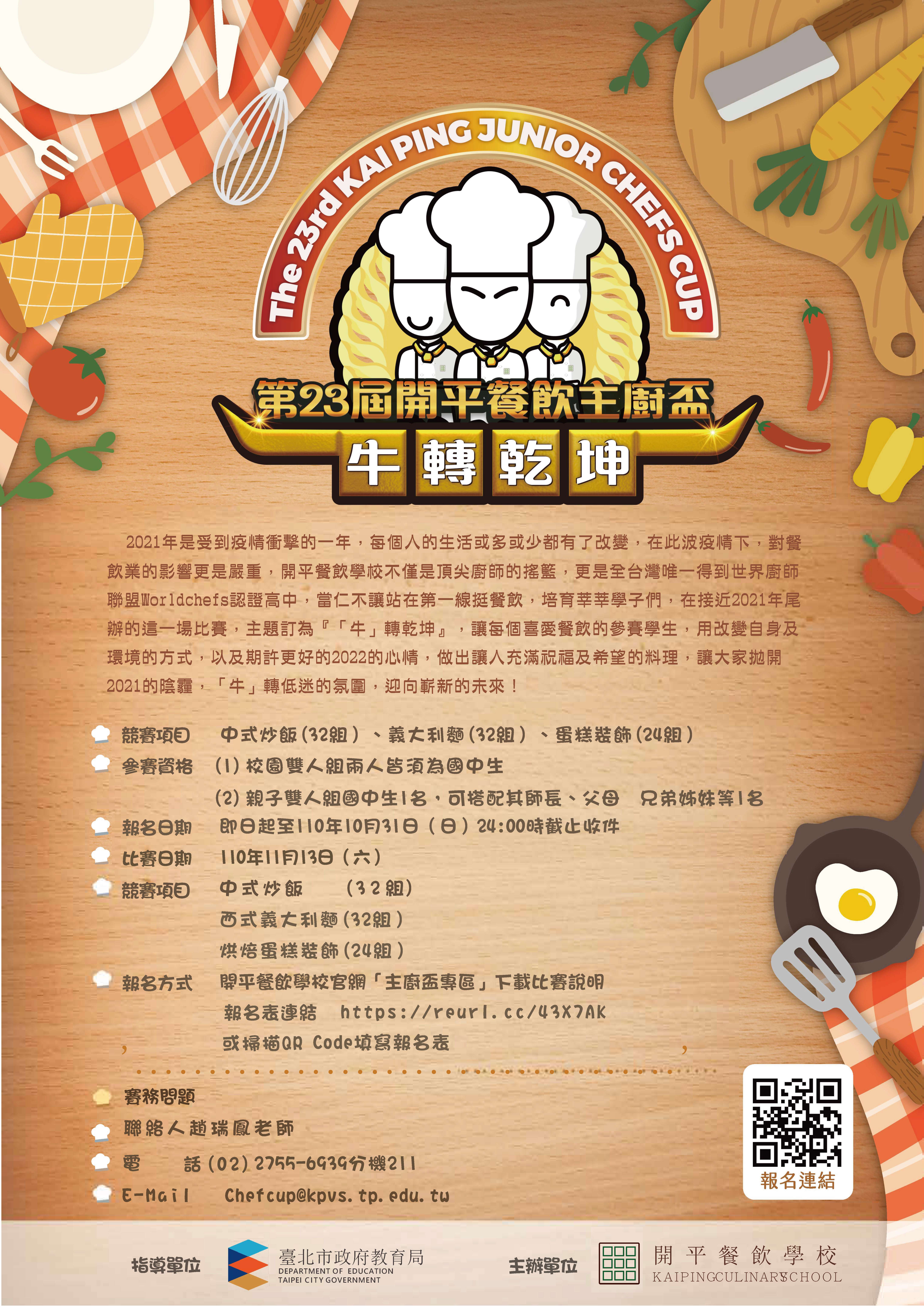 二、本屆比賽項目:分「中式炒飯」、「義大利麵」、及「蛋糕裝飾」三項。藉由『「牛」轉乾坤』主題,邀請對餐飲有興趣的國中生,發揮創作力,製作出讓人充滿祝福及希望的料理,讓大家拋開陰霾,「牛」轉低迷的氛圍,迎向嶄 新的未來!