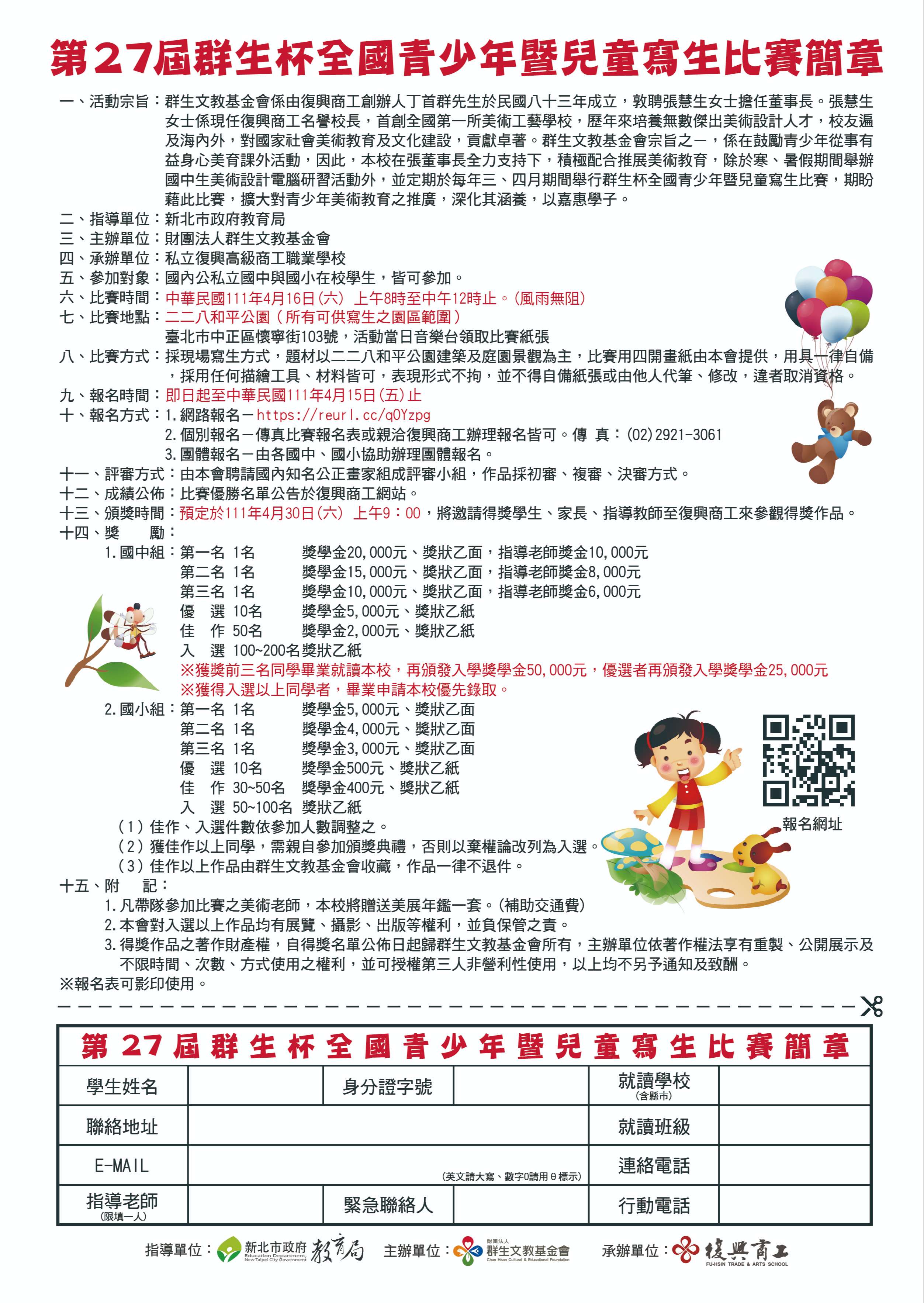 六、比賽簡章公告於群生基金會網站首頁http://210.71.66.14/ischool/publish_page/193/,敬請下載查閱。