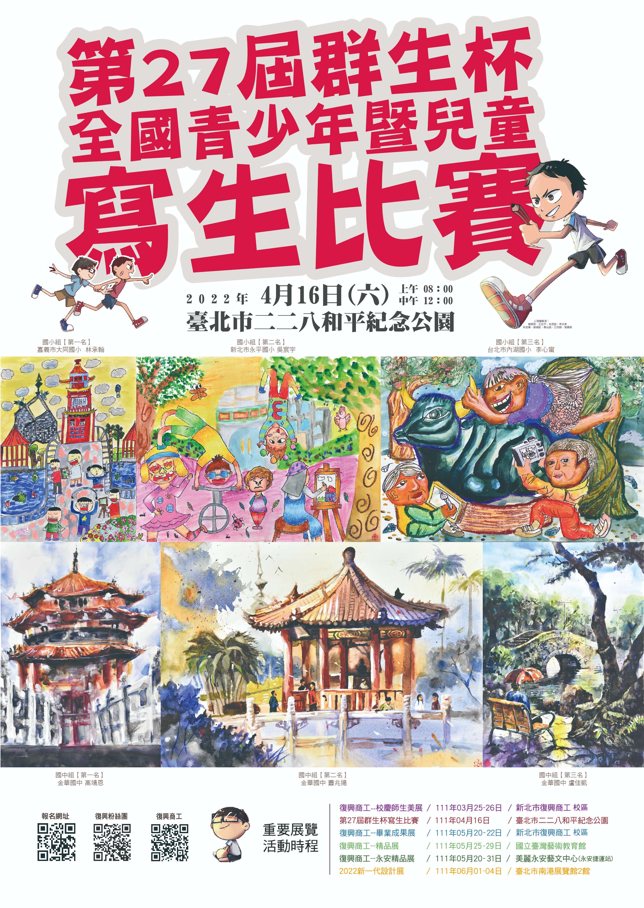 三、比賽方式:採現場寫生方式,題材以二二八和平公園建築 及庭園景觀為主,比賽用四開畫紙由本會提供,用具一律 自備,採用任何描繪工具、材料皆可,表現形式不拘,並 不得自備紙張或由他人代筆、修改,違者取消資格。